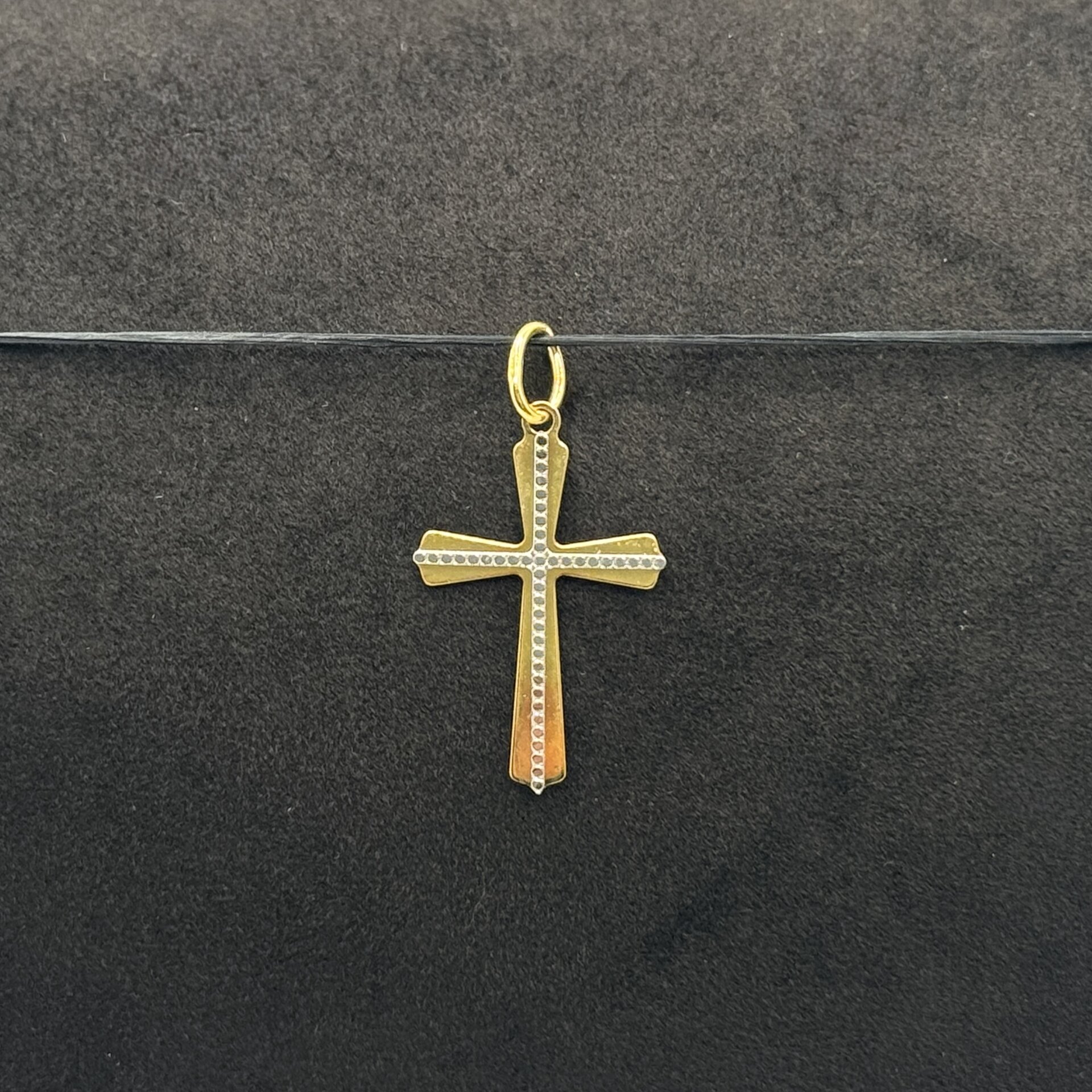 La croce, con dimensioni 24 × 15 mm, presenta proporzioni equilibrate che la rendono ben visibile ma mai eccessiva, ideale sia per l’uso quotidiano sia per occasioni speciali. Il bicolore conferisce profondità e carattere al design, rendendo questo ciondolo un accessorio versatile, facilmente abbinabile a diverse tipologie di catene.