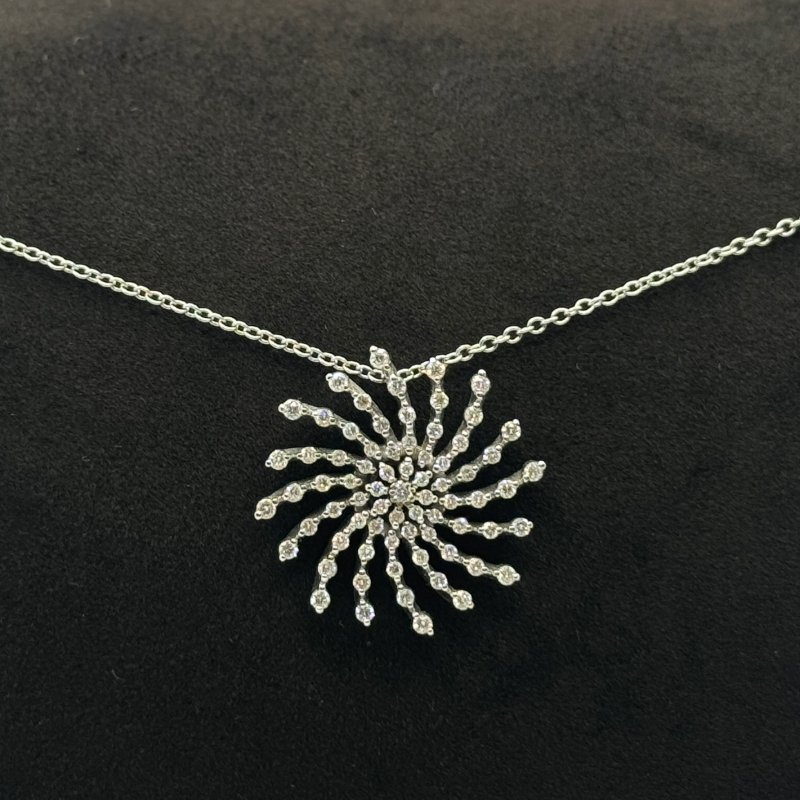 La Collana Polello C81998C rappresenta l’eccellenza dell’alta gioielleria italiana. Realizzata in oro bianco 18 kt dal peso di 8,10 grammi, presenta un elegante ciondolo da 21 mm impreziosito da diamanti naturali taglio brillante per un totale di 0,49 ct, selezionati con colore G per garantire massima luminosità e purezza.