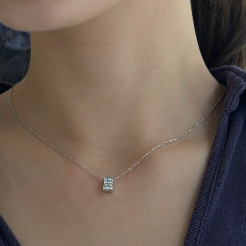 La catenina in oro bianco da 40 cm, con pratica chiusura a moschettone, garantisce comfort e sicurezza, rendendo questa collana adatta a ogni occasione: dalle cerimonie alle serate speciali, fino a un tocco di luce per il quotidiano.