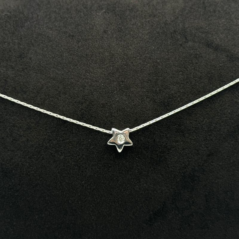 Collana Punto Luce a Stella in oro bianco 18 kt con diamante 0,01 ct. Lunghezza 45 cm, ciondolo 5 mm. Scatola e garanzia Gioielleria Fegadoli.