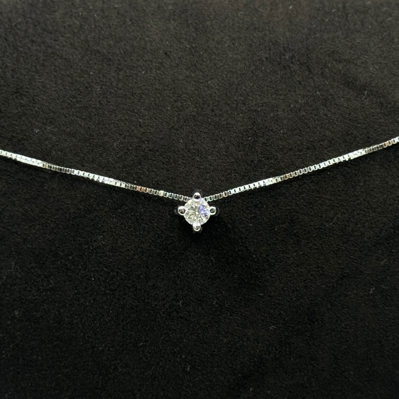 Collana Yukiko Punto Luce in oro bianco 18 kt con diamante 0,20 ct H IF. Lunghezza 42 cm, ciondolo 5 mm. Scatola e garanzia ufficiale Yukiko.