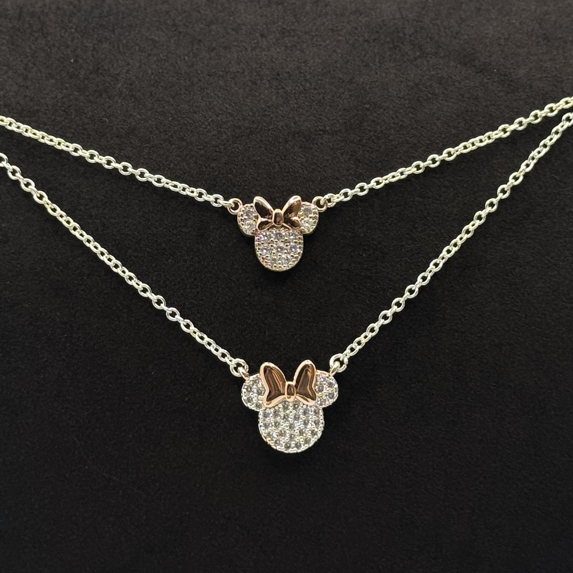 Collane Disney Mamma e Figlia in argento sterling con Swarovski. Set da due collane nickel free, ciondoli 9×10 mm e 11×12 mm. Con scatola e garanzia ufficiale Disney.