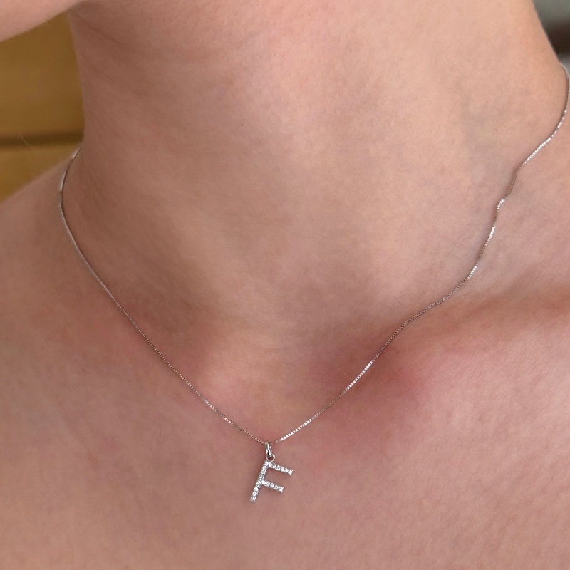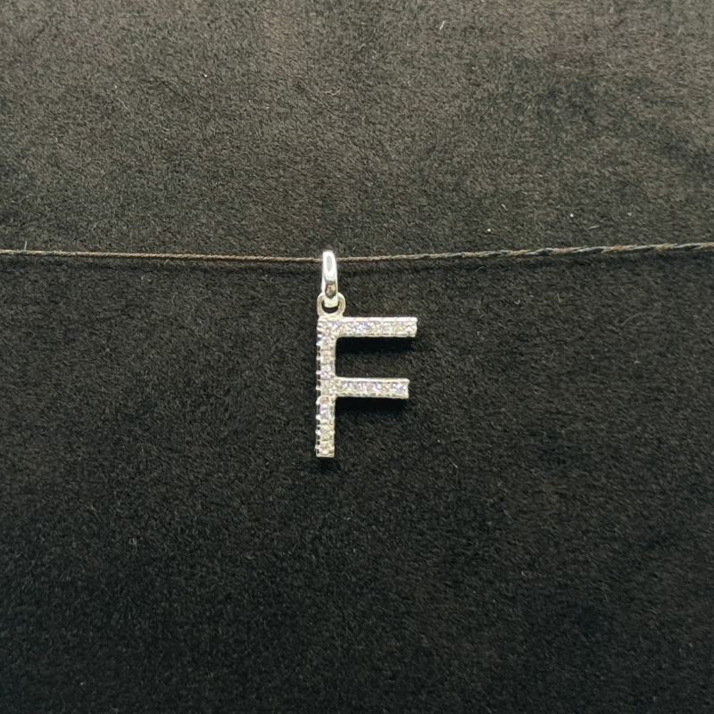 Ciondolo Ambrosia Iniziale F in oro bianco 18 Kt con swarovski. Altezza 14 mm. Catena non inclusa. Confezione e certificazione ufficiale Ambrosia Gioielli.