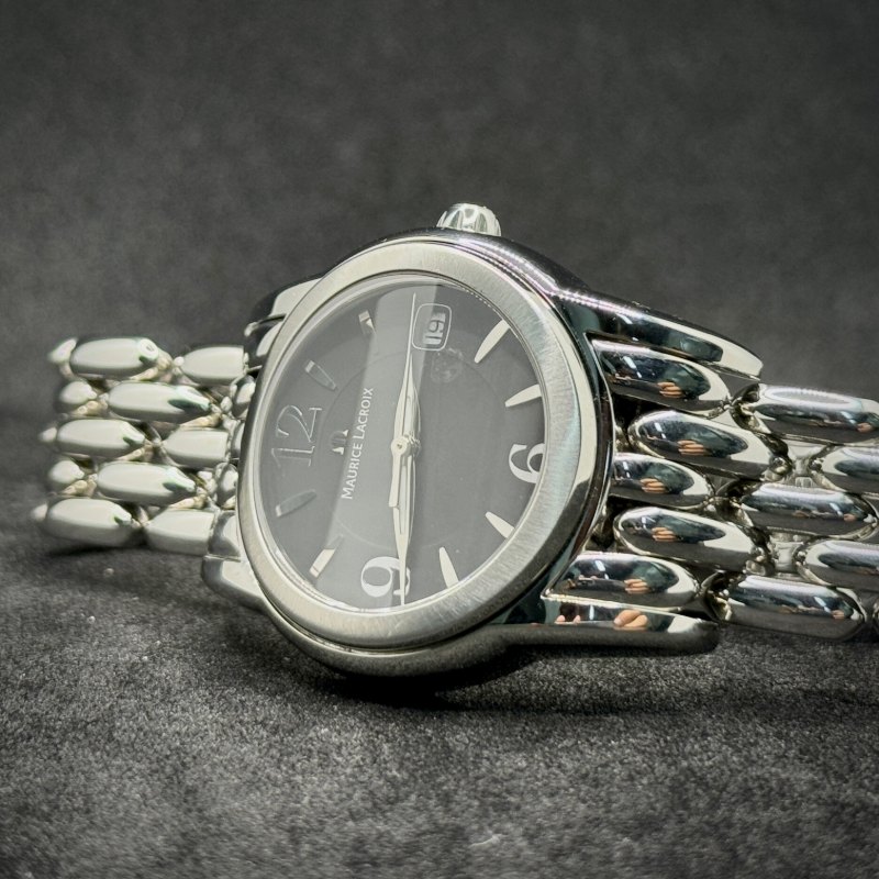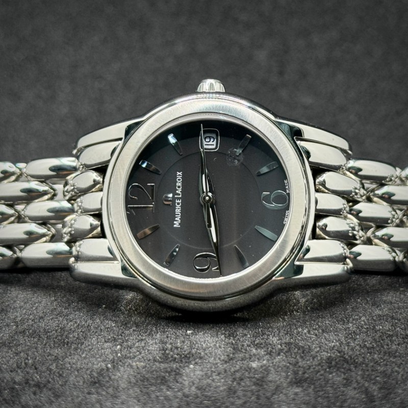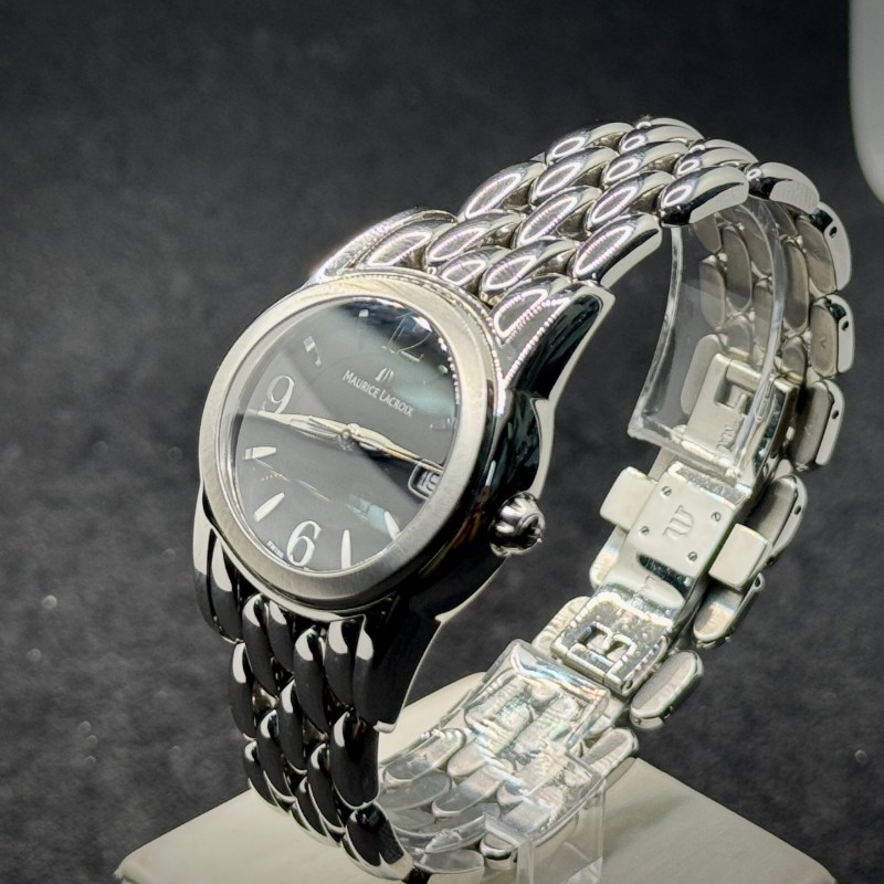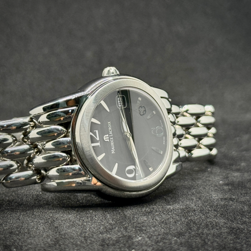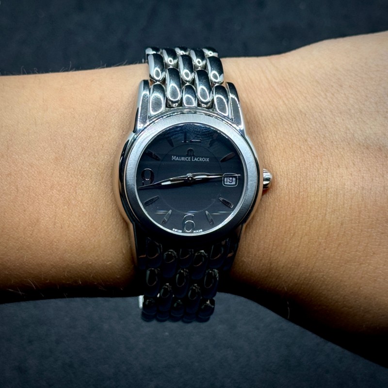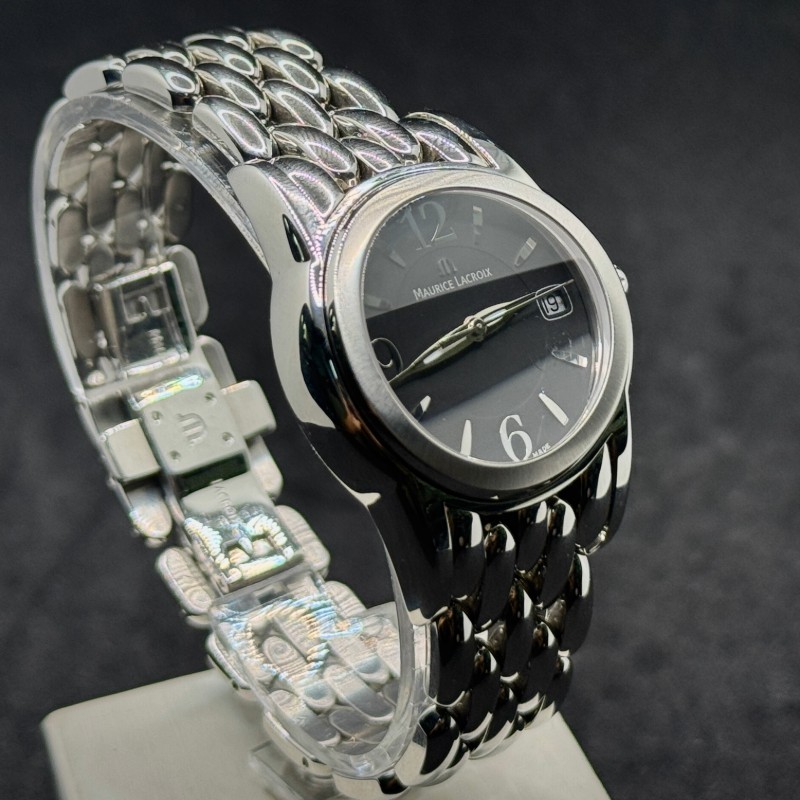Maurice Lacroix Damen Uhr Sphere SH1014 in acciaio 34 mm, quarzo, quadrante nero con data, vetro zaffiro, WR 10 ATM. Scatola originale, garanzia 12 mesi.