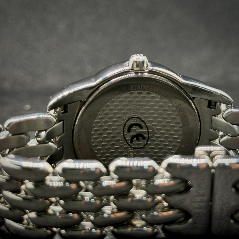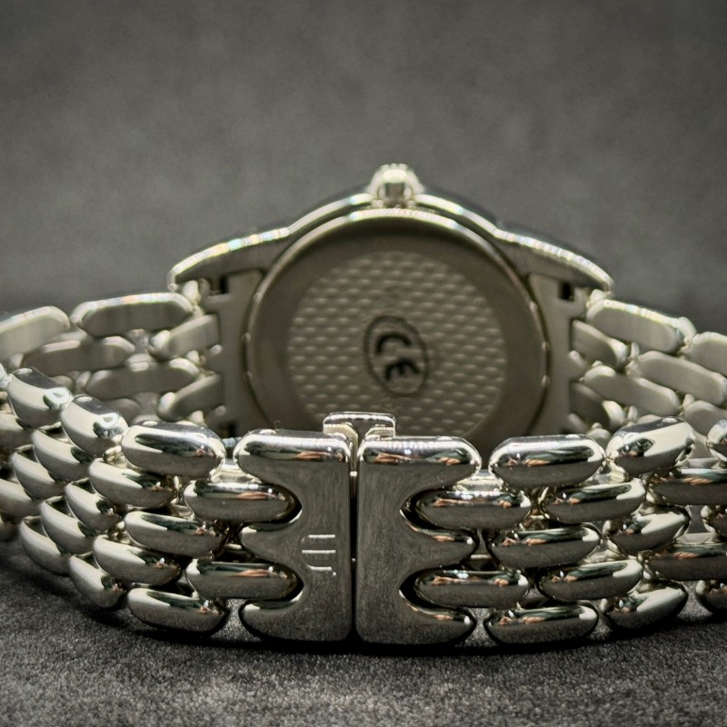 Il quadrante nero è arricchito da datario e indici discreti, perfettamente protetto da un resistente vetro zaffiro, che ne esalta brillantezza e durevolezza. La chiusura déployante assicura comodità e sicurezza, mentre il movimento al quarzo garantisce precisione e affidabilità in ogni momento.
