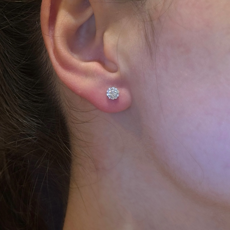 Ogni orecchino presenta un diamante centrale da 0,13 ct, elegantemente rialzato per catturare al meglio la luce, accompagnato da diamanti laterali per un totale di 0,05 ct che amplificano la brillantezza complessiva. Con un diametro di 5,5 mm e chiusura classica a farfallina, questi orecchini uniscono raffinatezza e praticità, rendendoli adatti sia all’uso quotidiano che alle occasioni più eleganti.