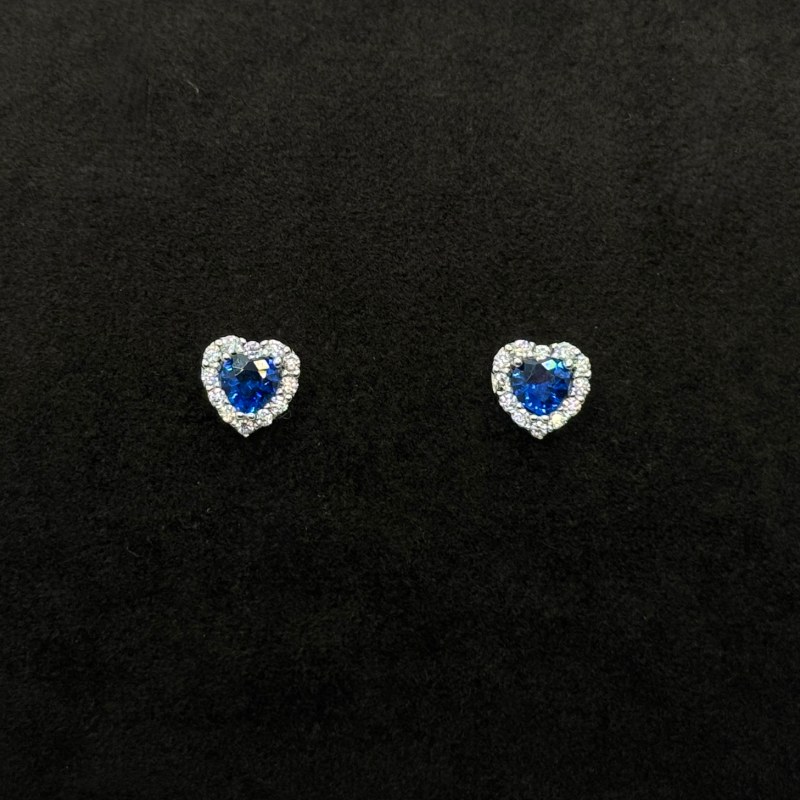 Orecchini a cuore in oro bianco 18 kt con Swarovski e pietra blu. Eleganti, raffinati e luminosi. Garanzia Gioielleria Fegadoli.