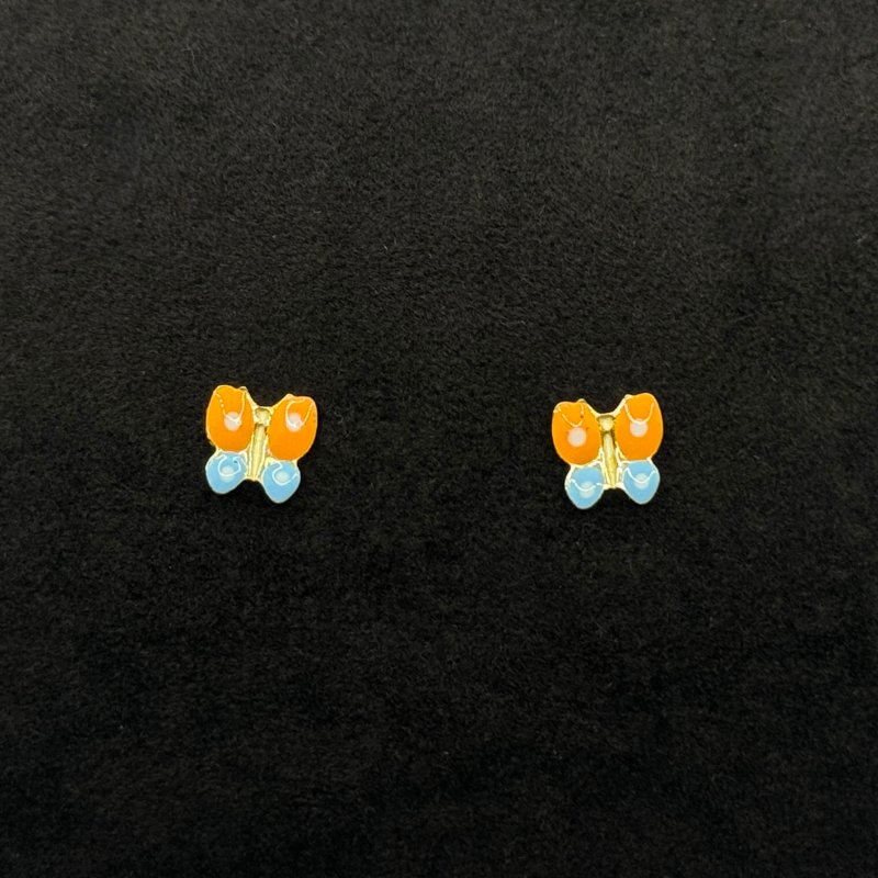 Orecchini farfalla in oro giallo 18 kt smaltati, misura 6×6 mm. Con chiusura a farfallina, eleganti e simbolici. Garanzia Gioielleria Fegadoli.