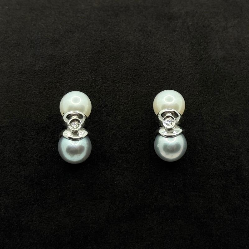 Orecchini Kiara in oro bianco 18 kt con diamanti e perle di acqua dolce bianche e grigie. Eleganza e raffinatezza in un gioiello senza tempo.