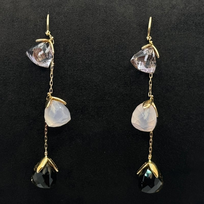 Orecchini Pendenti Comete Oro Giallo 18 kt Ametista, Quarzo Rosa e Quarzo Fumè