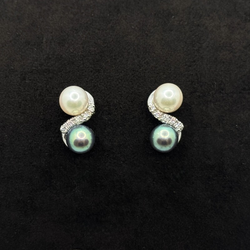 Orecchini Yukiko in oro bianco 18 kt con perle Acoja bianche e nere da 6,5 mm e diamanti 0,10 ct. Raffinati e garantiti Yukiko.