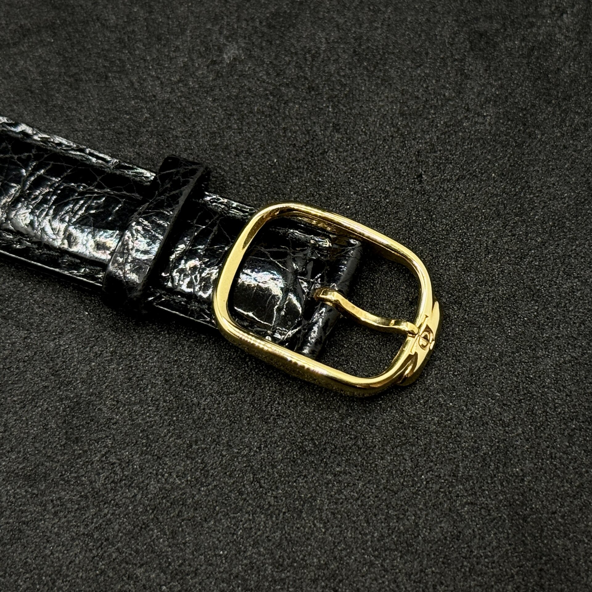 Il cinturino originale in pelle di coccodrillo nero, abbinato alla fibbia in oro 18 kt con logo inciso, completa un’estetica classica e ricercata.