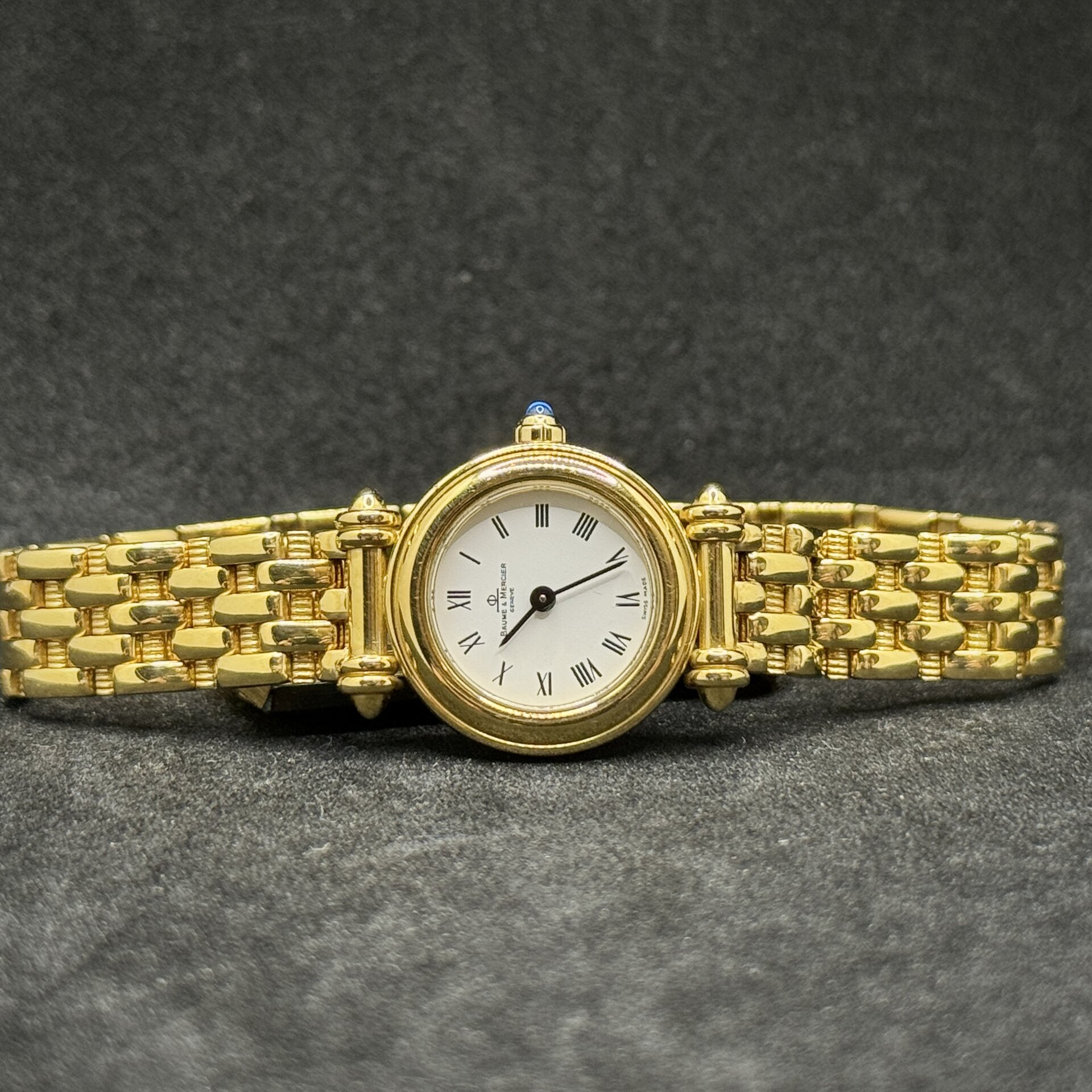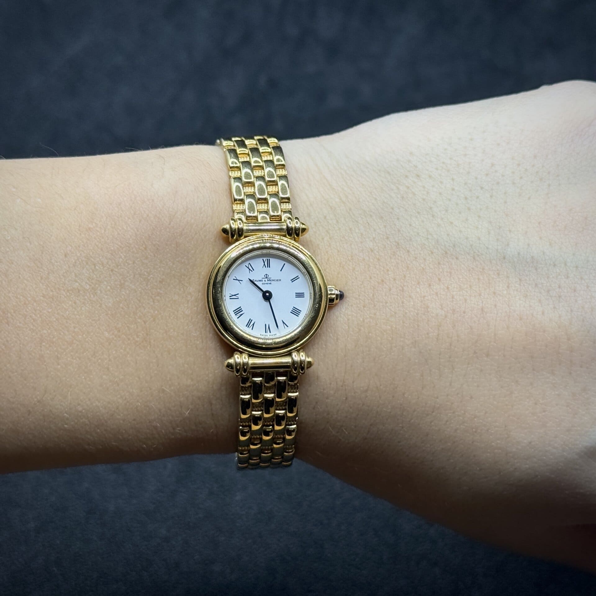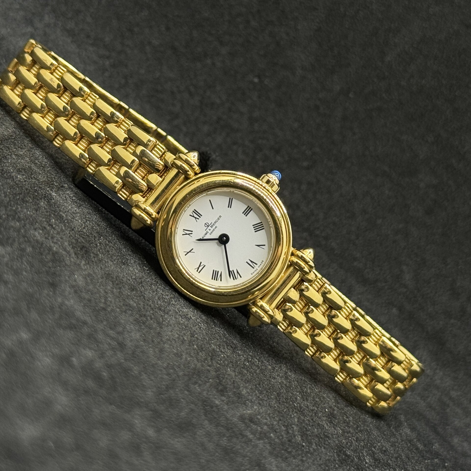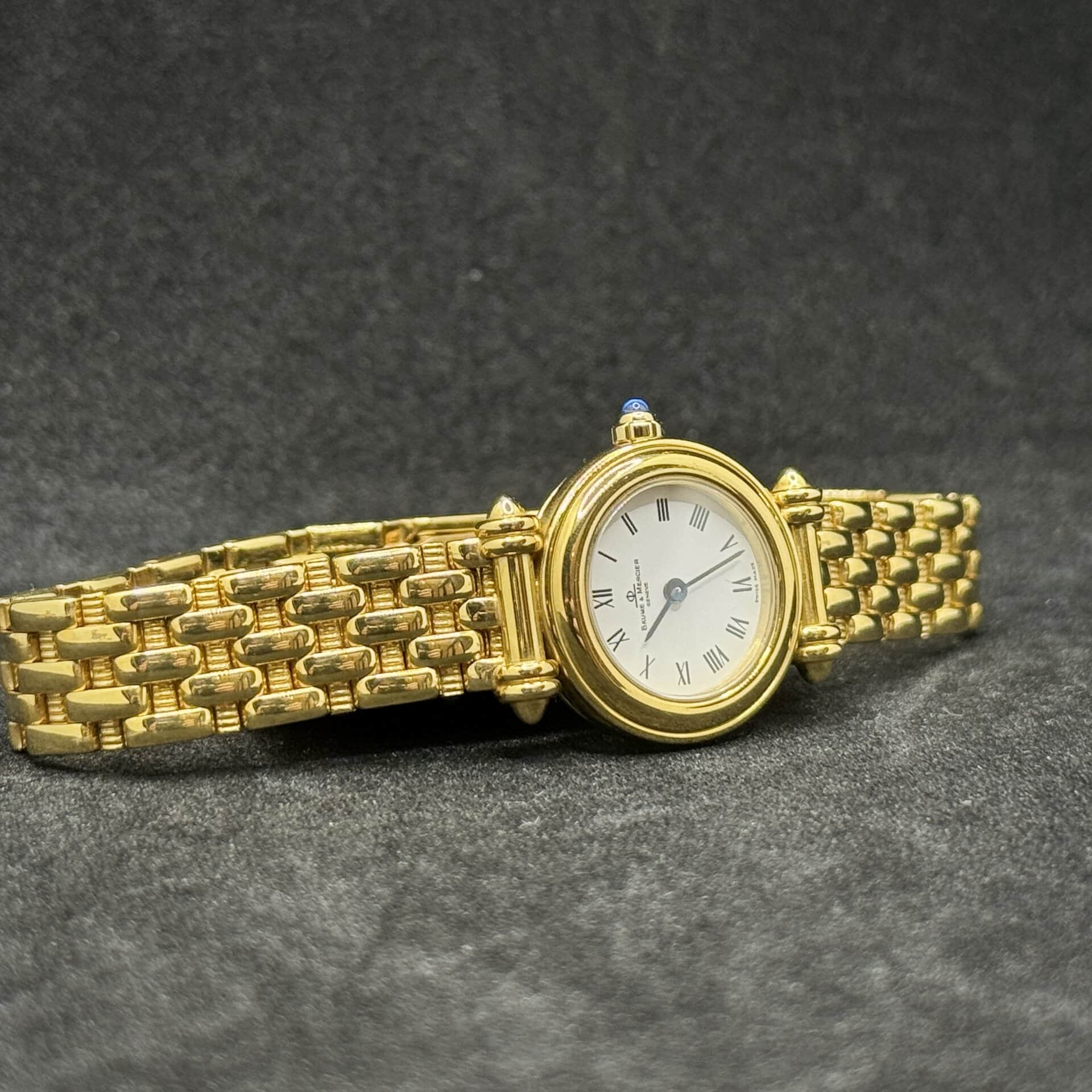 Baume & Mercier vintage in oro giallo 18 kt con cinturino integrato, movimento al quarzo e vetro zaffiro. Eleganza svizzera di alto valore.