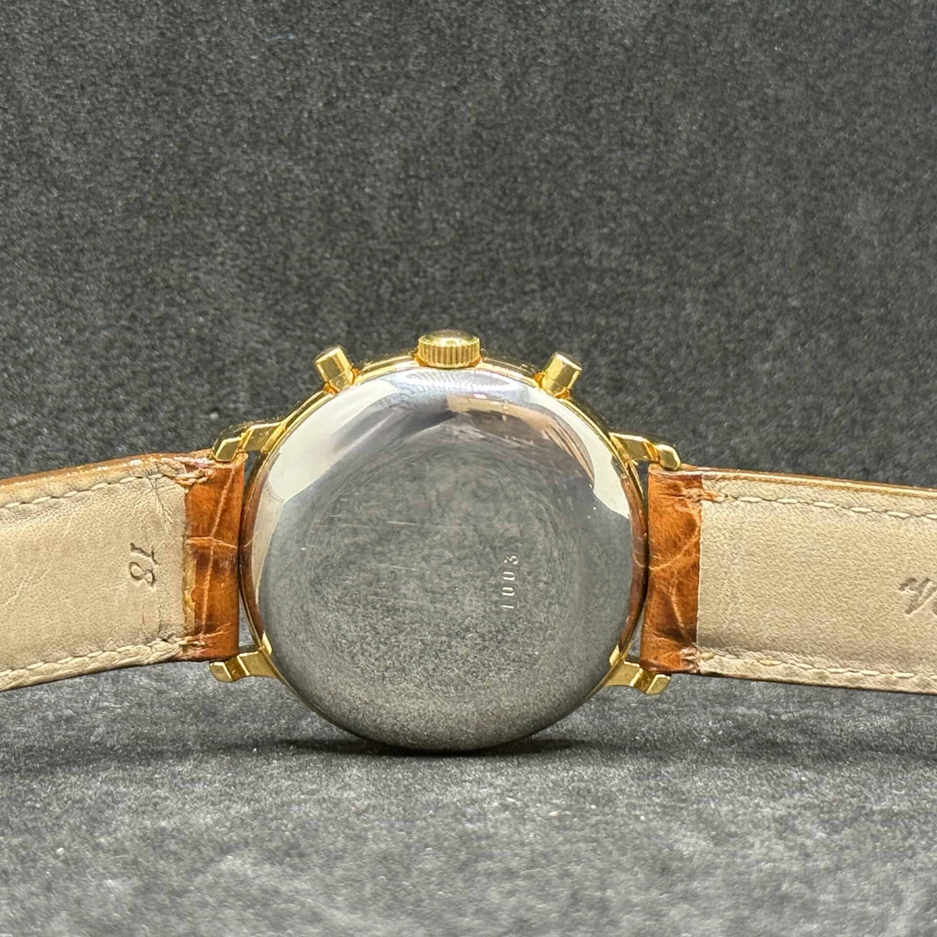 La cassa da 36 mm in laminato oro conferisce eleganza e presenza al polso, mantenendo proporzioni classiche e versatili. Le condizioni sono buone, coerenti con l’età dell’orologio. Il vetro zaffiro assicura resistenza ai graffi e protezione del quadrante.