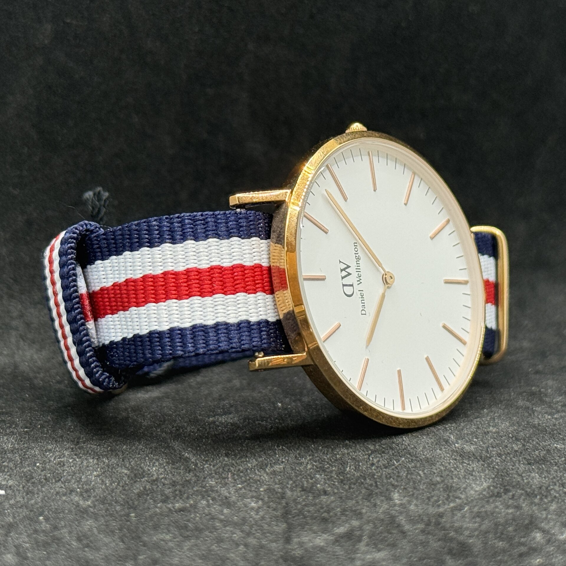 Orologio Daniel Wellington placcato oro rosè, 41 mm, quadrante bianco e cinturino in tessuto. Movimento al quarzo, vetro zaffiro. Con scatola e garanzia ufficiale DW.