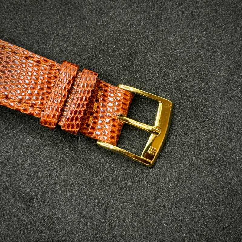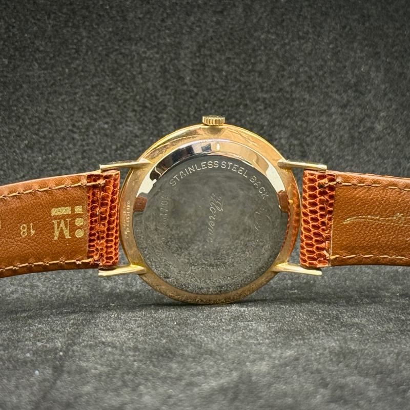 La cassa da 34 mm, placcata in oro, custodisce un movimento meccanico di alta affidabilità, interamente revisionato e garantito 24 mesi. Il vetro plexiglas conserva il fascino originale del periodo, mentre il cinturino in pelle, sostituito e facilmente intercambiabile, aggiunge un tocco di classe contemporanea.