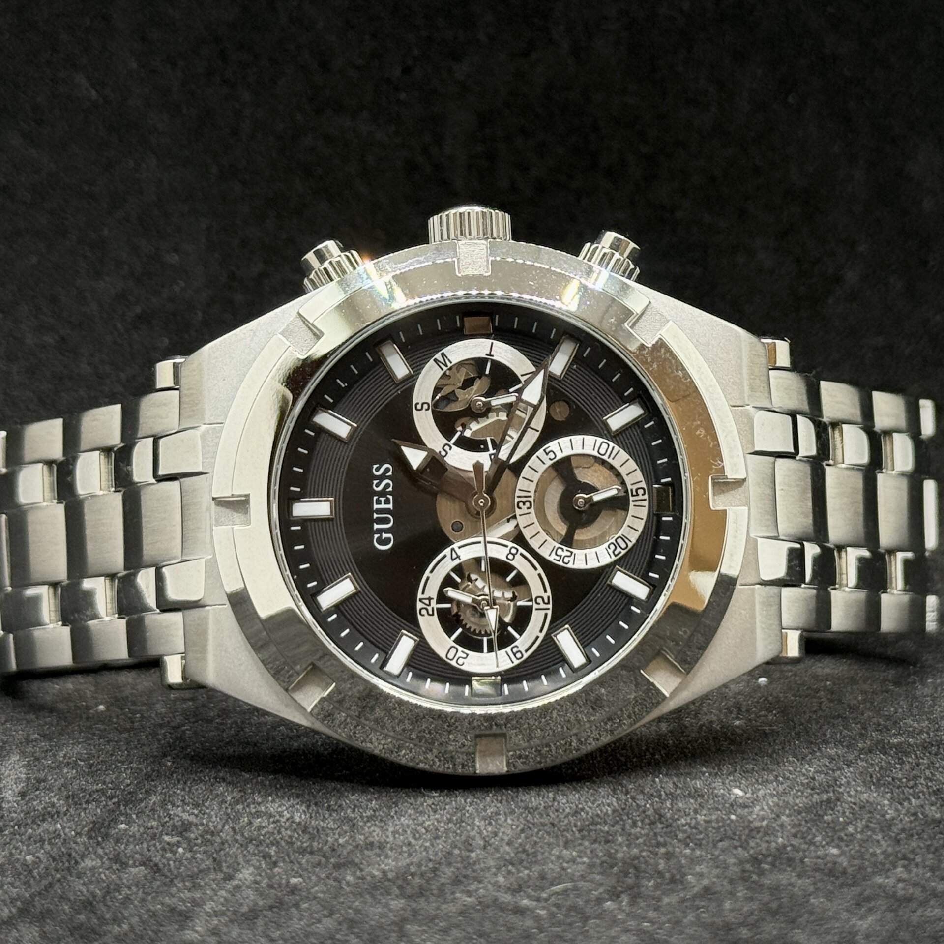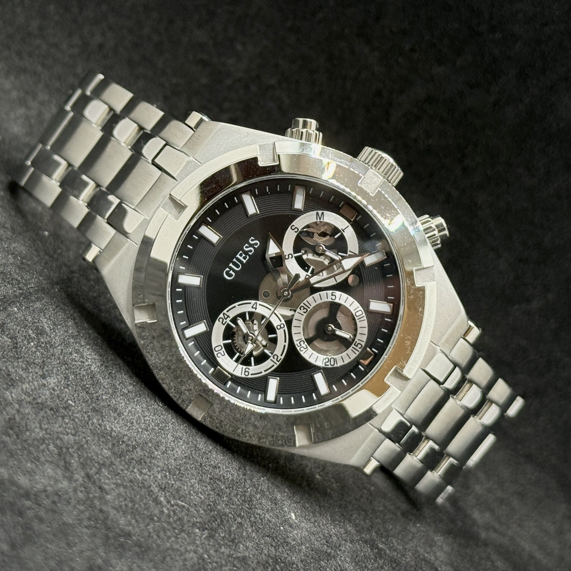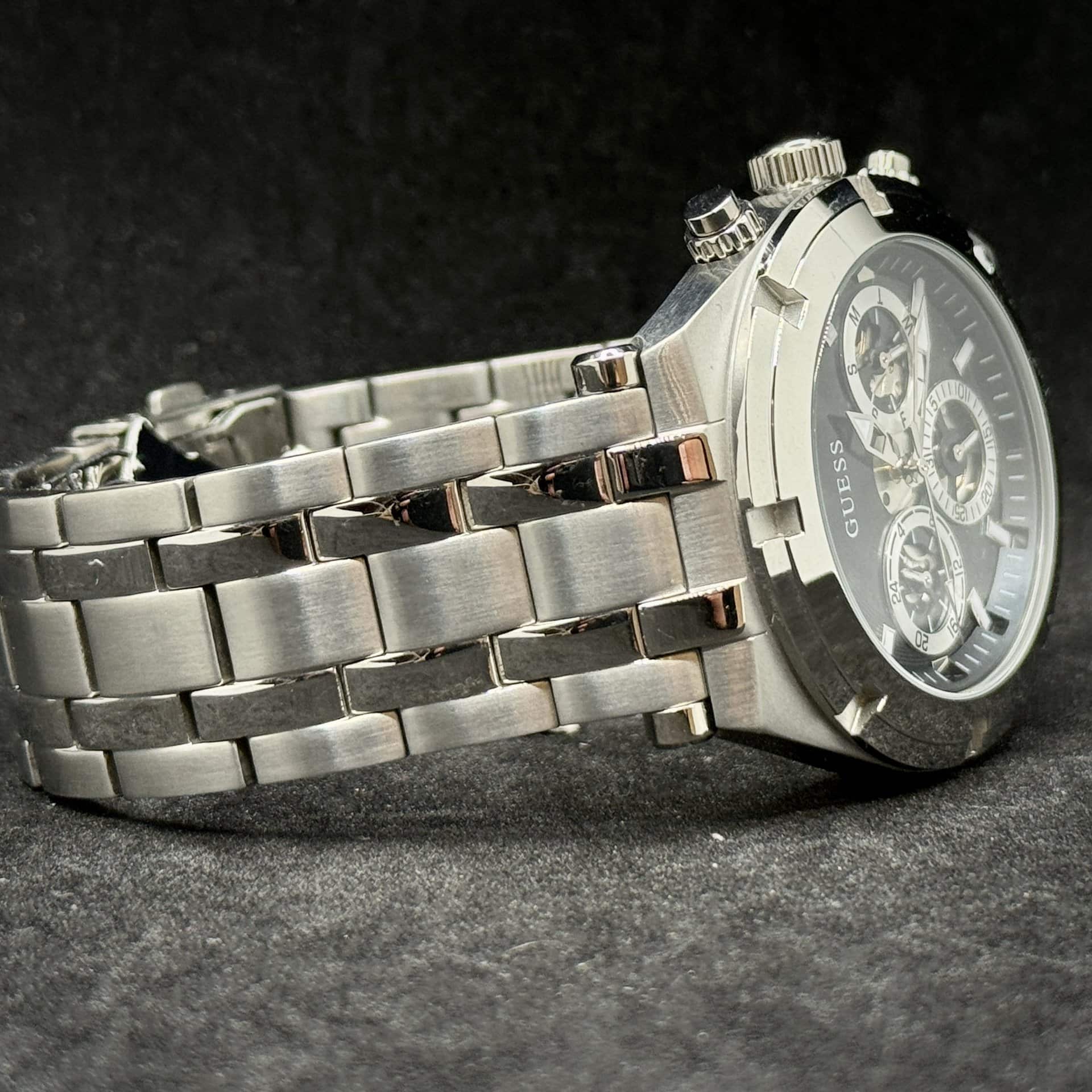 Orologio Guess Uomo GW0260G1 in acciaio lucido e satinato, quadrante nero, movimento al quarzo. Funzioni tempo, chrono, data e 24h. Cassa 44 mm. Nuovo con confezione originale e garanzia ufficiale 2 anni.