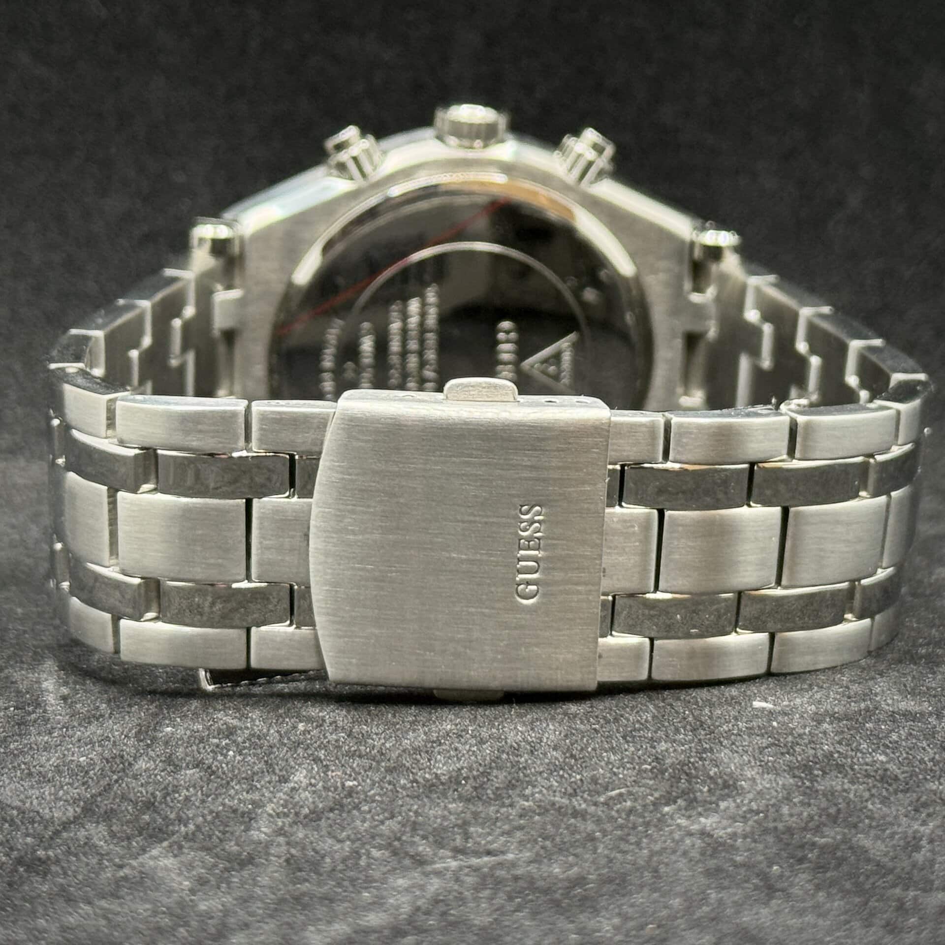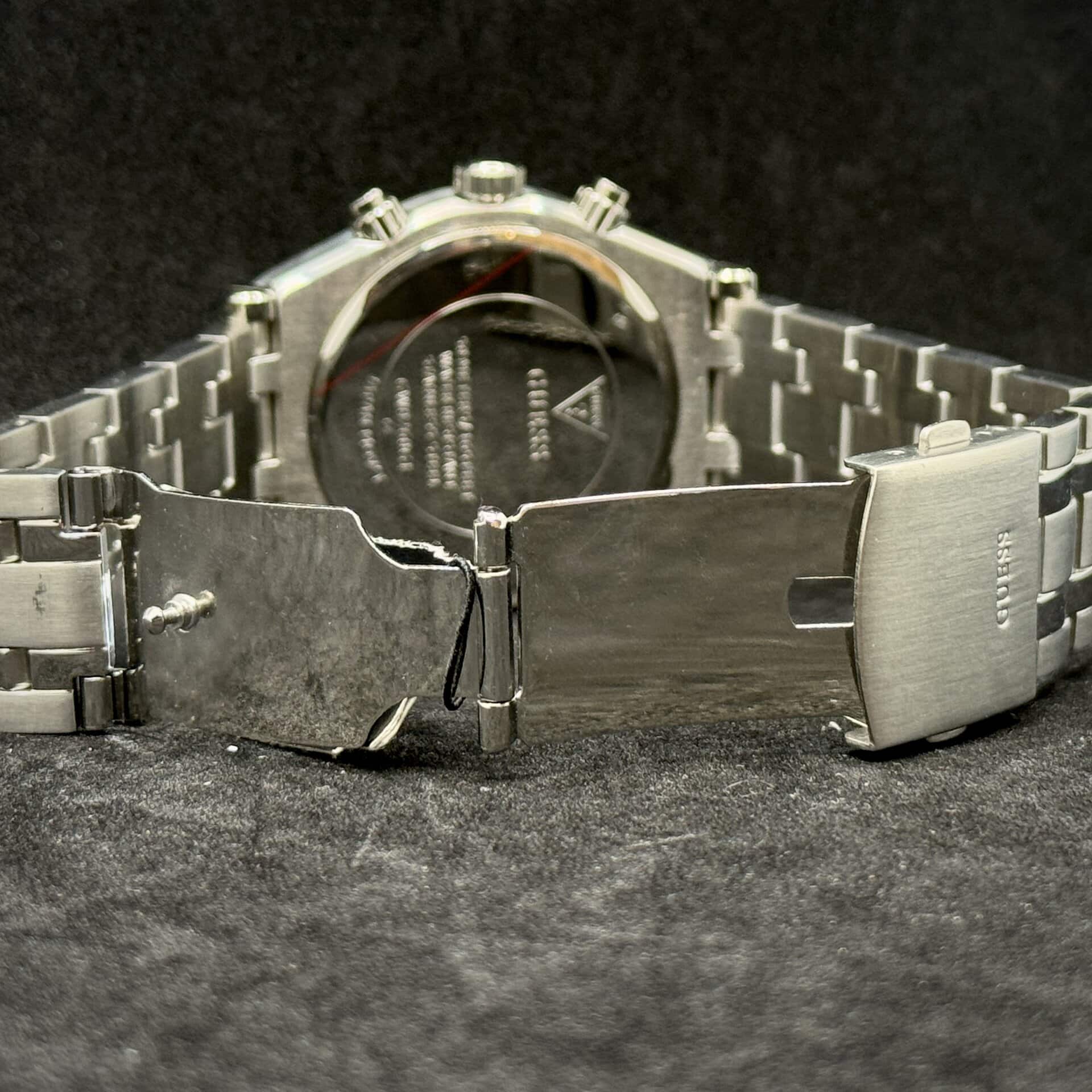 Il movimento al quarzo garantisce precisione e affidabilità, mentre il vetro minerale protegge l’orologio dai piccoli urti quotidiani. La corona a pressione completa il design funzionale, mantenendo la linea pulita e contemporanea tipica degli orologi Guess.