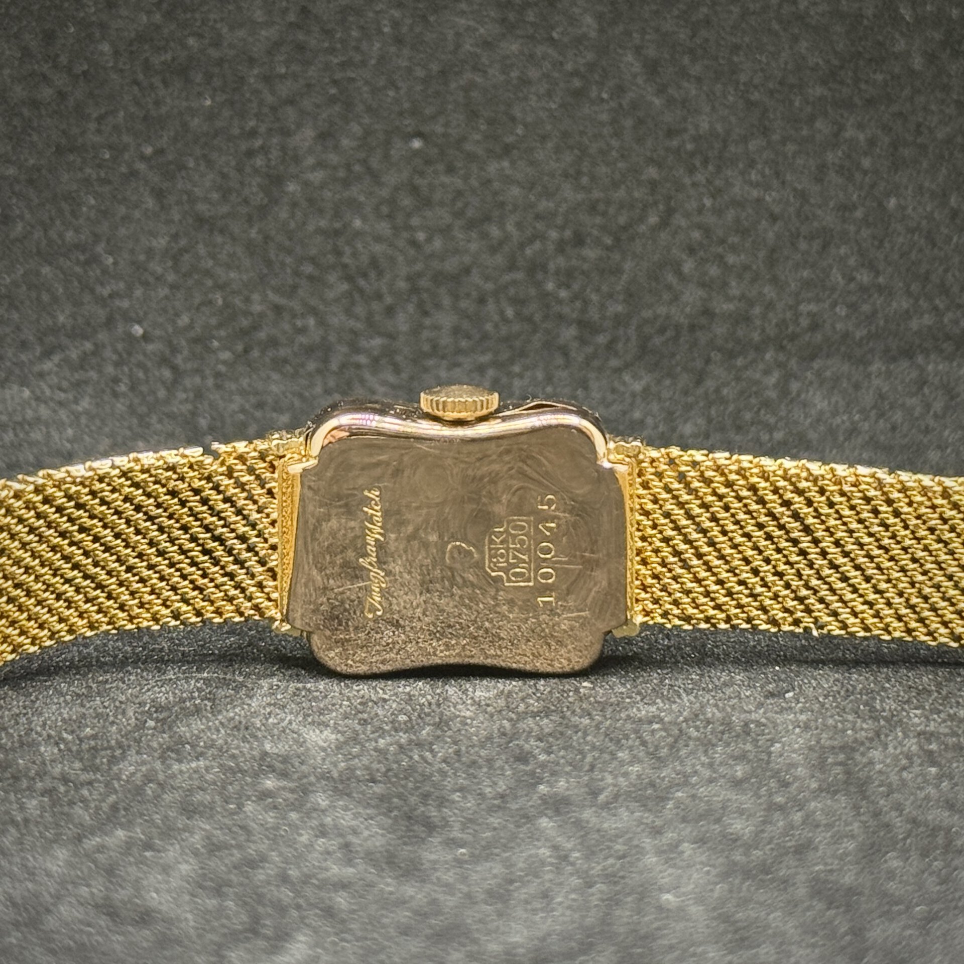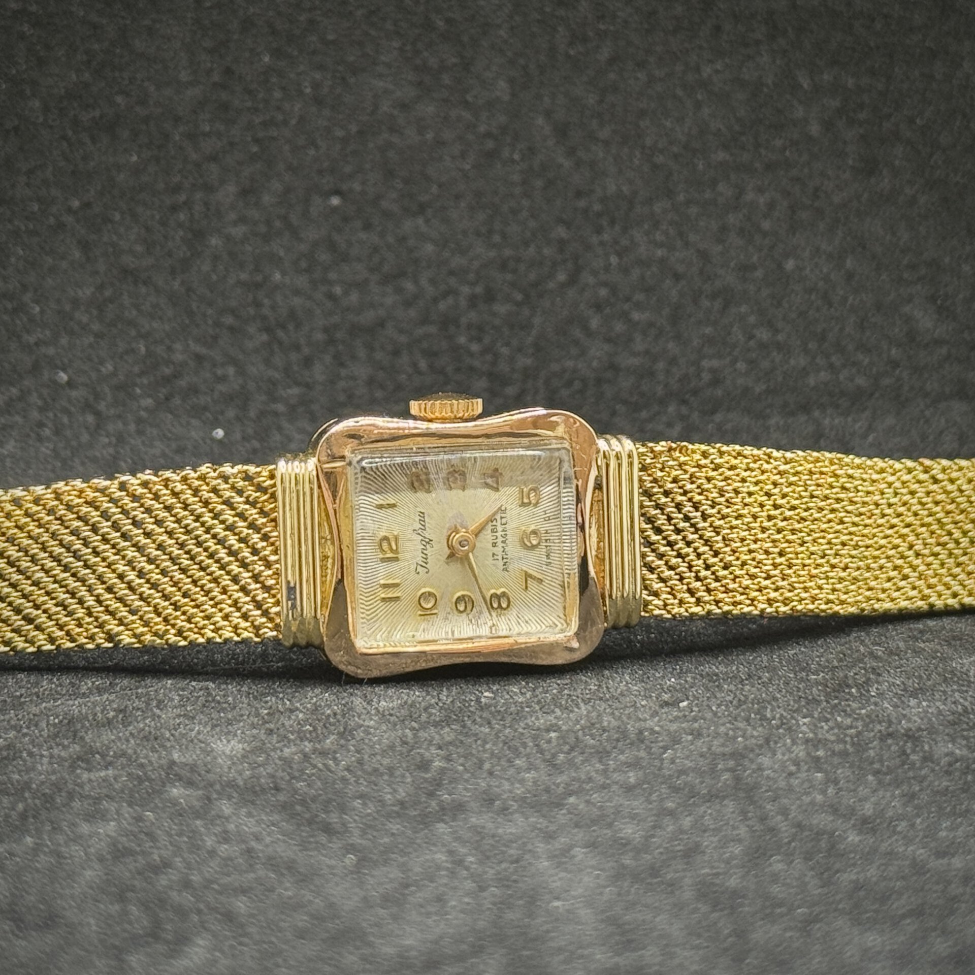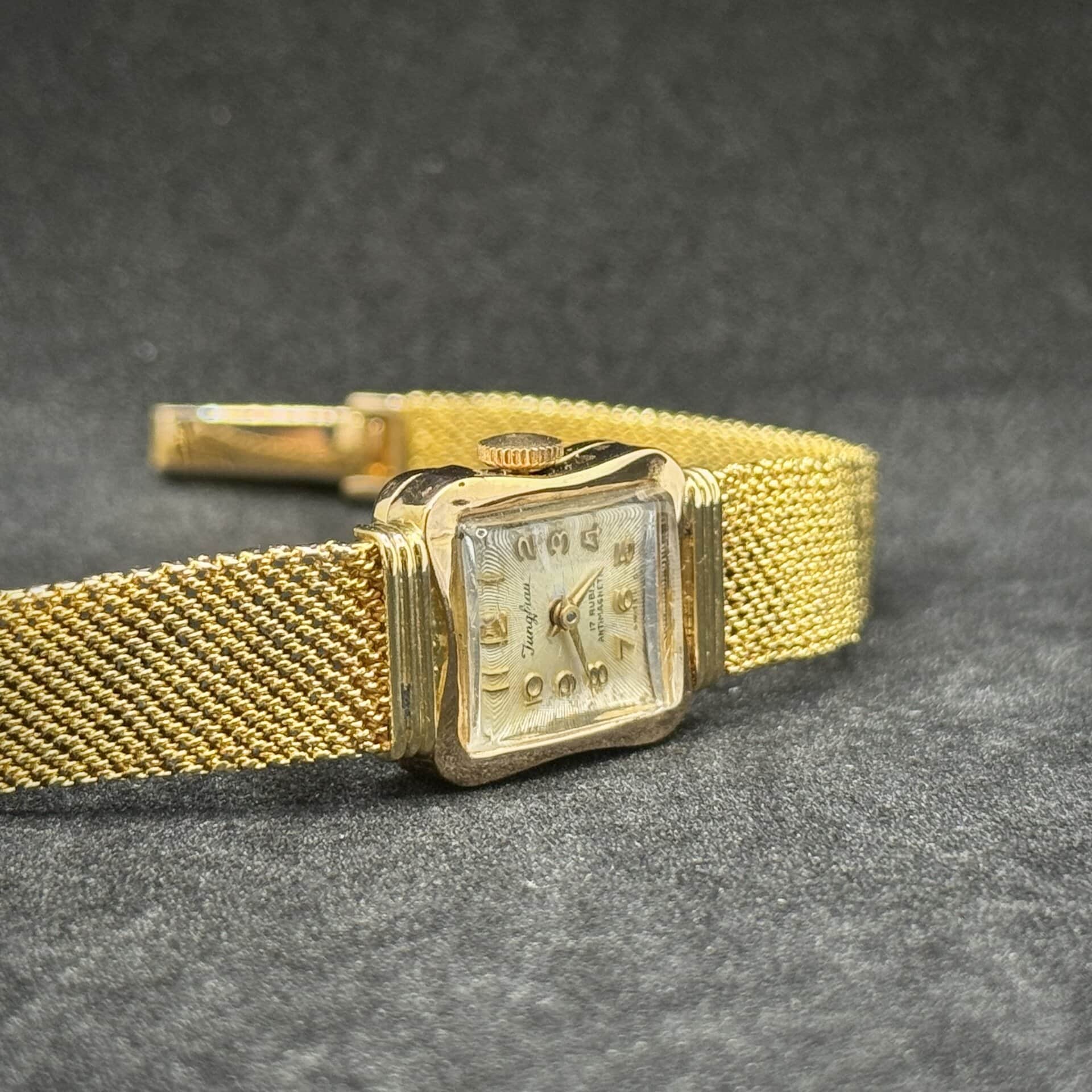 Orologio Jungfrau in oro 18 kt (26,5 g) con movimento a carica manuale. Cassa 15×17 mm, cinturino originale in oro, vetro Plexiglass. Buone condizioni, garanzia 24 mesi, foto reali.