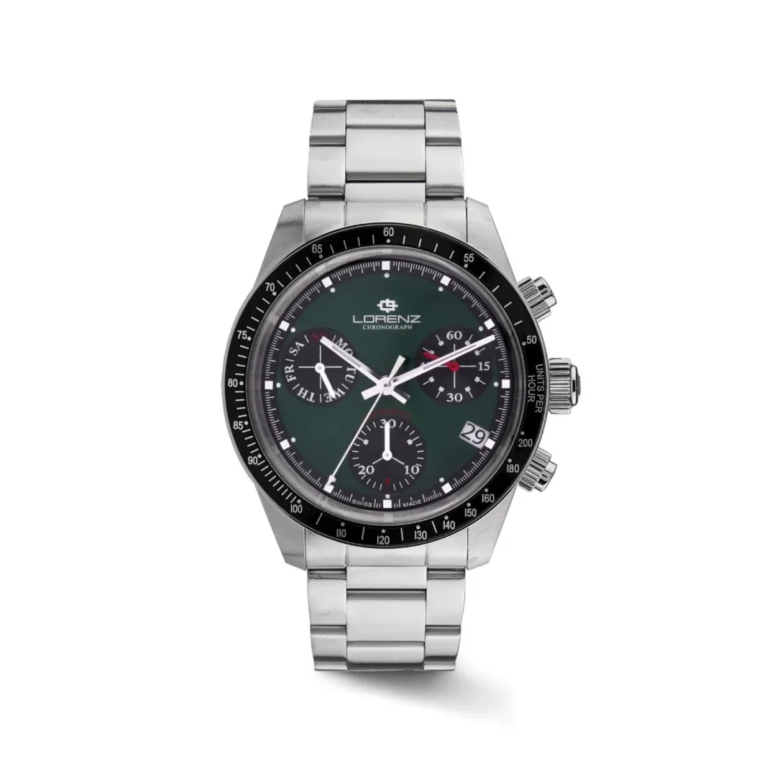 Lorenz California ref. 090003GR con movimento Swiss Made Ronda Z60, cronografo, quadrante verde e vetro K1 bombato. Sportivo ed elegante.