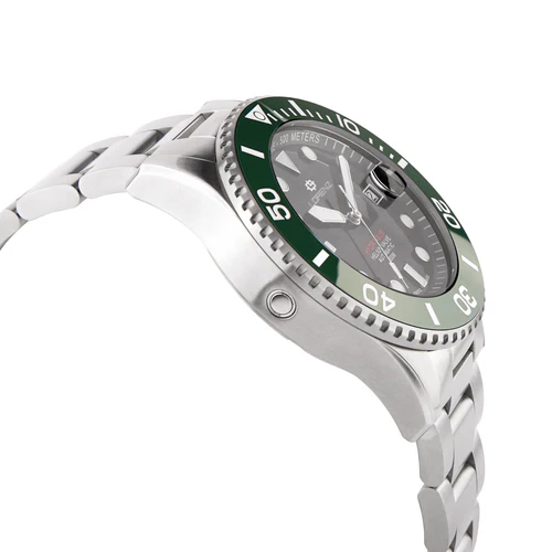 Il quadrante degradé dal nero al verde dona profondità e personalità, mantenendo un’ottima leggibilità. Il bracciale in acciaio satinato assicura comfort e solidità, mentre la dotazione aggiuntiva di cinturino in gomma aumenta la versatilità dell’orologio, rendendolo perfetto anche per l’uso sportivo e marino.