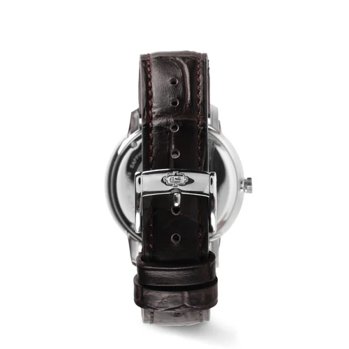 Il quadrante argento spazzolato e lucido crea un elegante gioco di riflessi, offrendo profondità visiva e ottima chiarezza di lettura. Il vetro zaffiro protegge il quadrante dai graffi e preserva l’estetica nel tempo. La lunetta fissa rafforza il carattere classico dell’orologio. Il cinturino in pelle stampa coccodrillo Made in Italy completa il segnatempo con un tocco di eleganza artigianale.