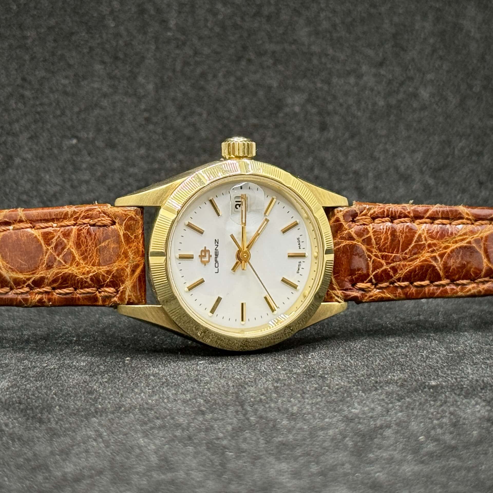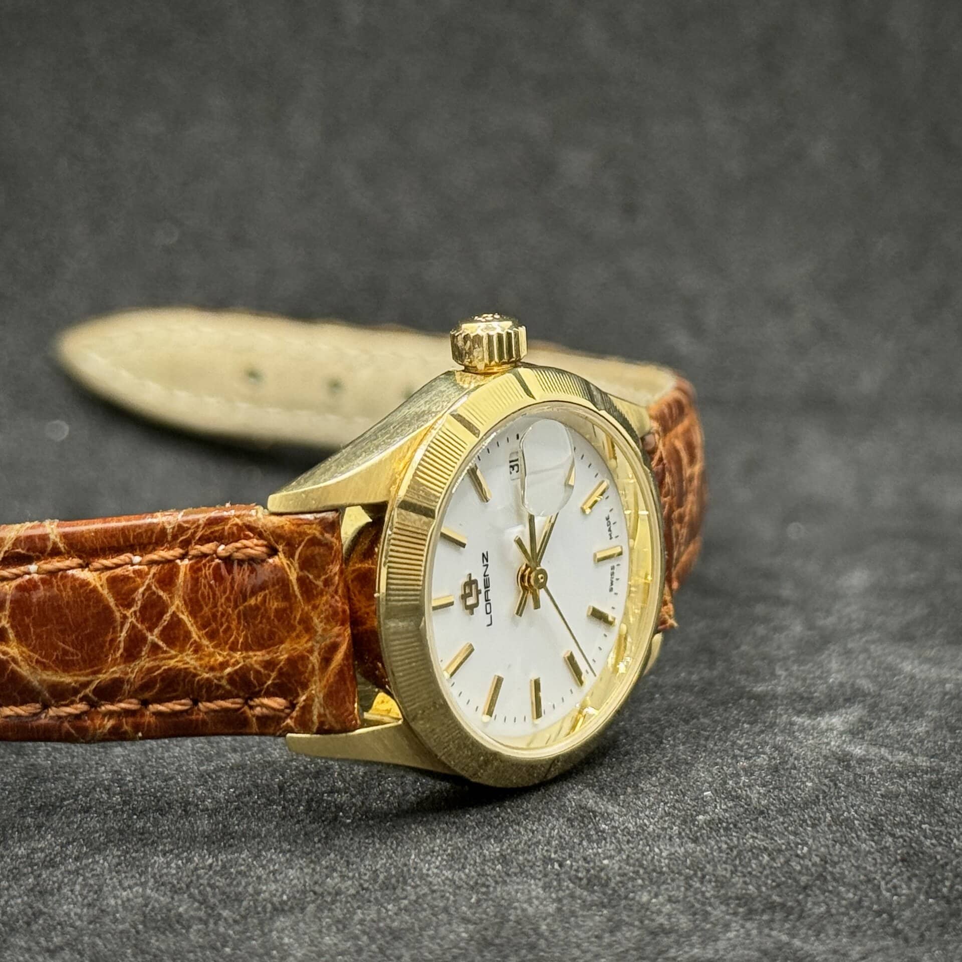 Orologio Lorenz 19445 in oro 18 kt (12,7 g) con movimento al quarzo ETA 956-112. Tempo e data, cassa 26 mm, vetro zaffiro, cinturino originale. Garanzia 24 mesi, foto reali.