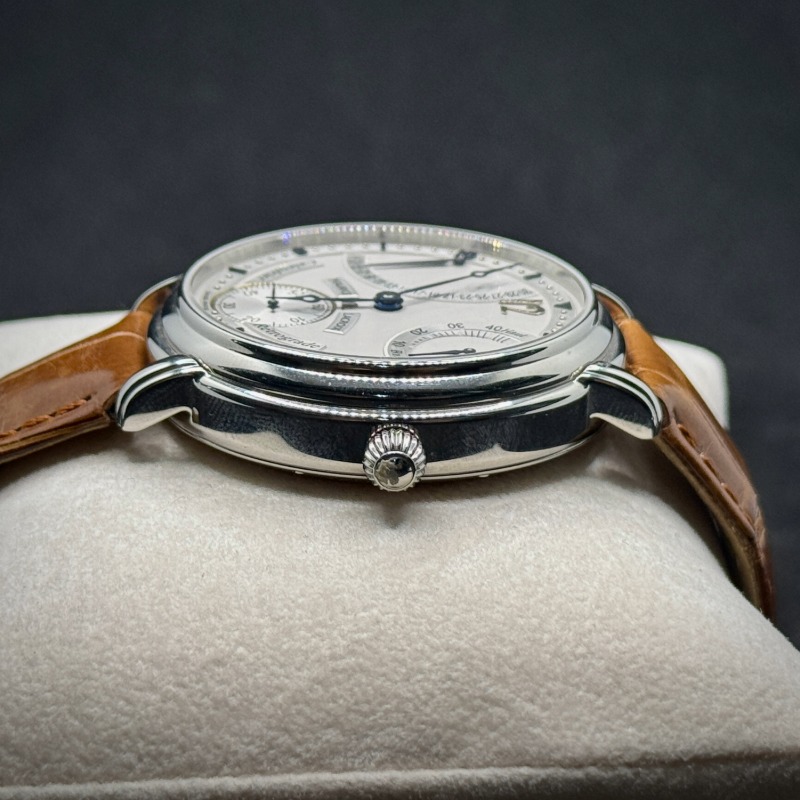 FUNZIONI: Calendario a retrograde a ore 10, indicazione della riserva di carica a ore 2, piccola lancetta dei secondi a ore 6