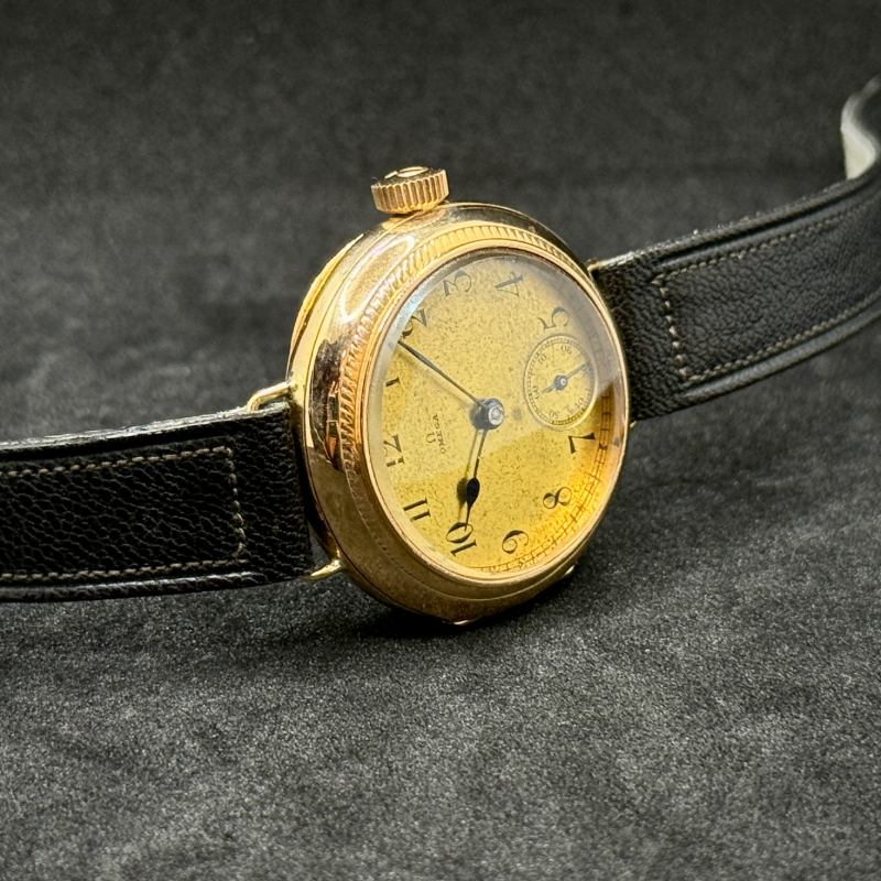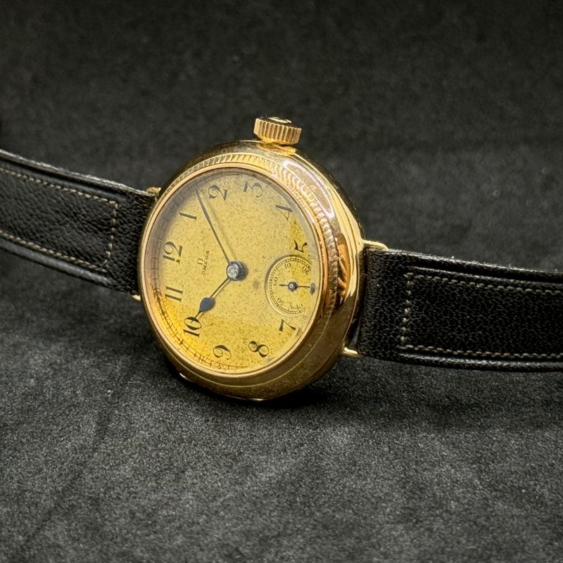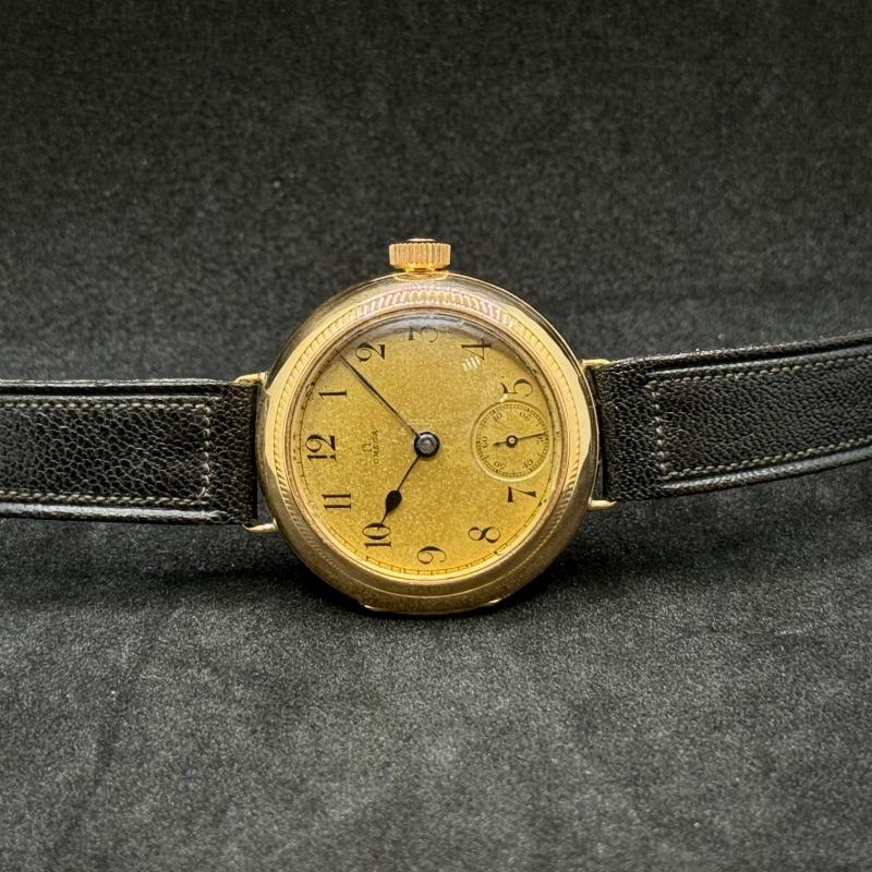 Orologio Omega vintage primi ’900 in oro 14 kt, cassa 34 mm, plexiglas, cinturino in pelle. Restaurato e garantito 24 mesi, disponibile subito.