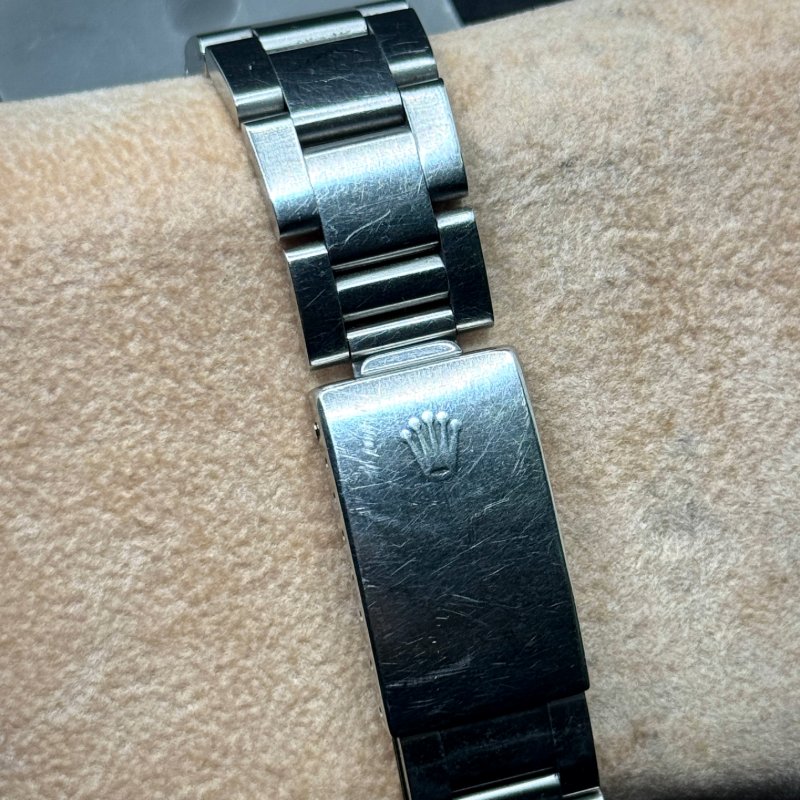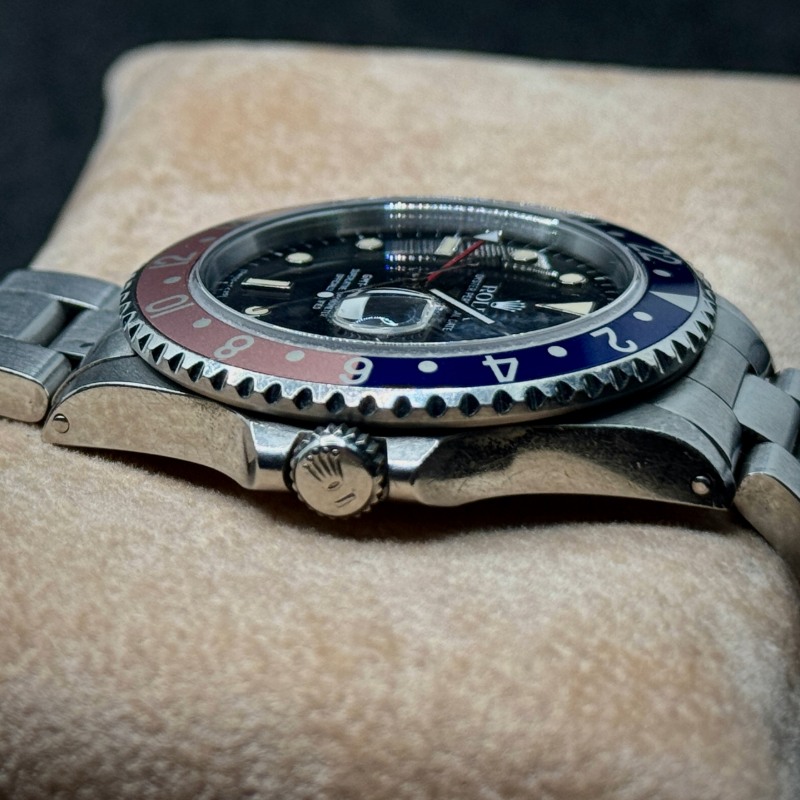 Il cuore dell’orologio è il movimento automatico Rolex 3185, noto per affidabilità e precisione. Così, le funzioni di tempo, data e secondo fuso orario (GMT) lo rendono ideale non solo per i viaggiatori ma anche per i collezionisti. Restaurato meccanicamente con un service ufficiale Rolex nel 2018, garantisce prestazioni impeccabili e conserva, tuttavia, intatto il suo carattere storico.