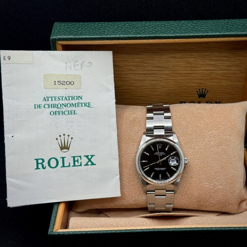 Rolex Date Ref. 15200 (1992) in acciaio con calibro 3135, datario e vetro zaffiro. Eleganza intramontabile con garanzia ufficiale.