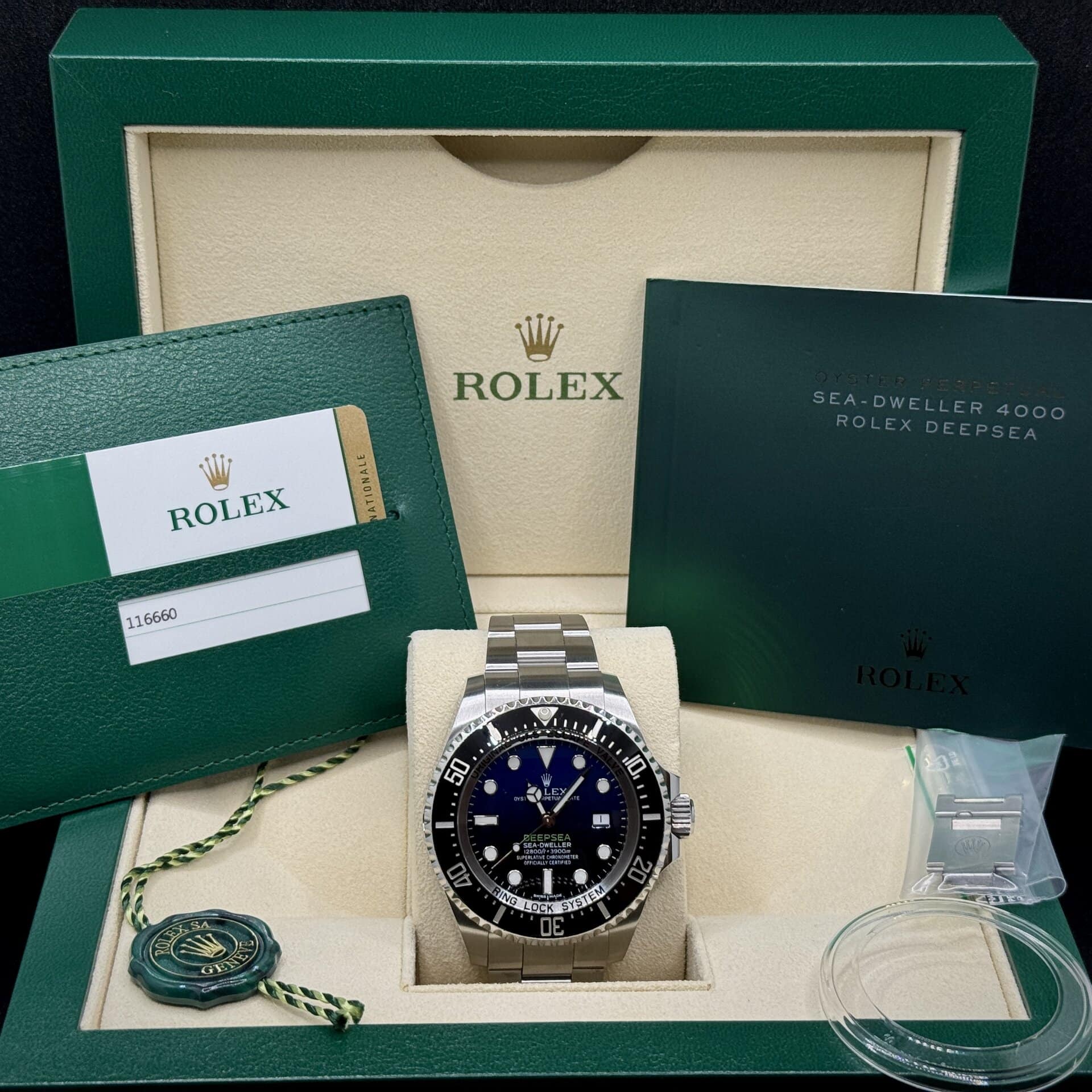 Rolex Sea-Dweller Deepsea 116660 anno 2016, condizioni come nuovo, Full Set originale, acciaio lucido e satinato, calibro automatico Rolex 3135, ghiera ceramica, vetro zaffiro, funzioni tempo e data. Garanzia 24 mesi e disponibilità immediata.
