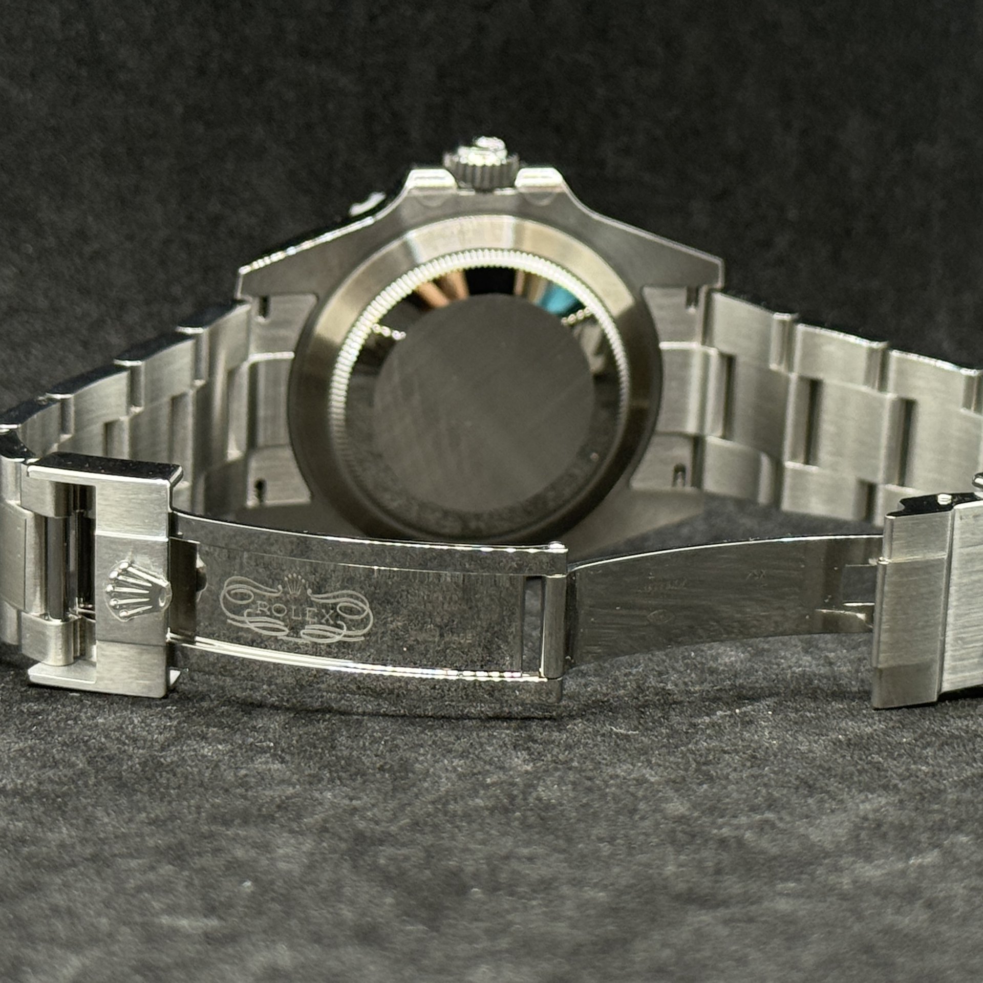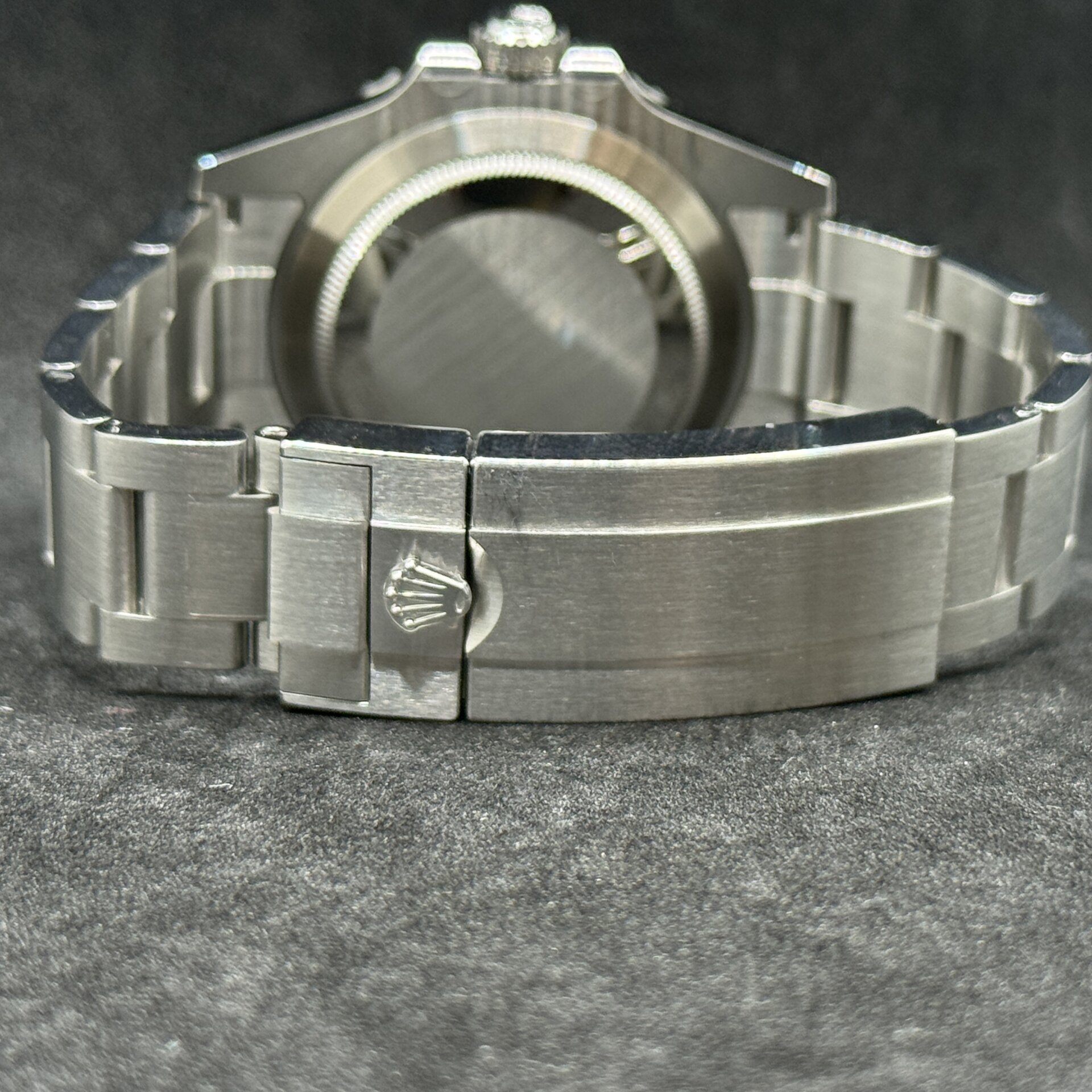 La cassa Oyster in acciaio lucido e satinato da 41 mm esprime robustezza ed equilibrio estetico. La lunetta girevole unidirezionale in ceramica nera con scala graduata è progettata per garantire massima resistenza ai graffi e precisione nelle immersioni. La corona a vite e la costruzione Oyster assicurano un’impermeabilità superiore alle 30 ATM, rendendolo uno strumento professionale oltre che un’icona di stile.