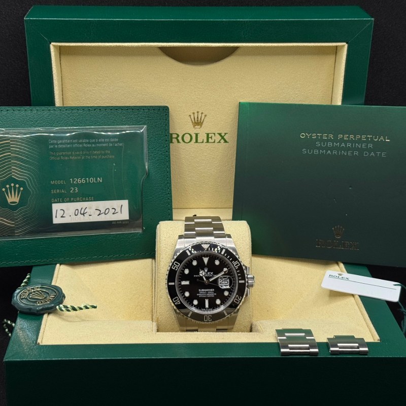 Rolex Submariner 126610LN anno 2021, Full Set con scatola e garanzia. Acciaio 41 mm, calibro 3235, lunetta ceramica nera, vetro zaffiro e impermeabilità 300 m.