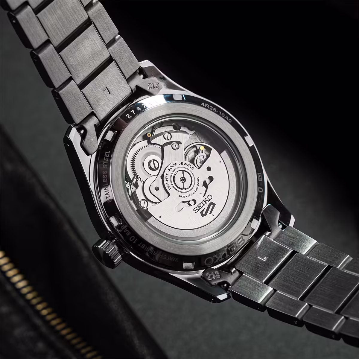 Il movimento è il Seiko calibro automatico 4R36 con 24 rubini, apprezzato per robustezza e precisione nel tempo. La funzione data aggiunge praticità all’uso quotidiano, mentre la meccanica automatica assicura un’esperienza autentica per gli appassionati.