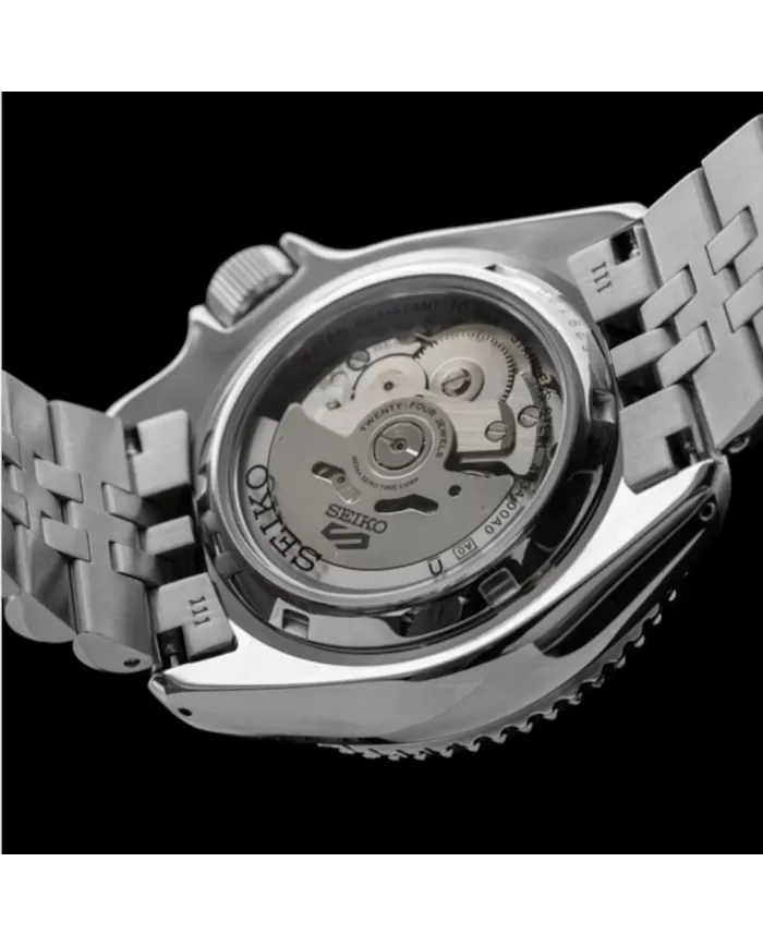 Al suo interno batte il movimento automatico Seiko calibro 4R34, dotato di 24 rubini, sinonimo di solidità meccanica e precisione nel tempo. La funzione GMT, abbinata alla data, consente di tenere sotto controllo un secondo fuso orario in modo semplice e intuitivo, rendendo questo modello estremamente pratico e funzionale.