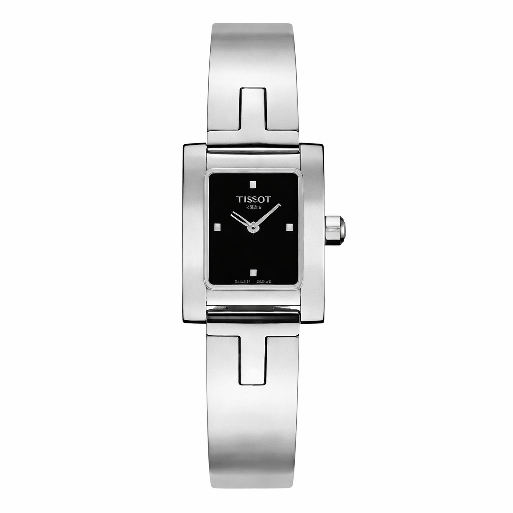 Tissot T-Trend 19 mm in acciaio con quadrante nero, vetro zaffiro e movimento al quarzo Swiss Made. Elegante e minimal.
