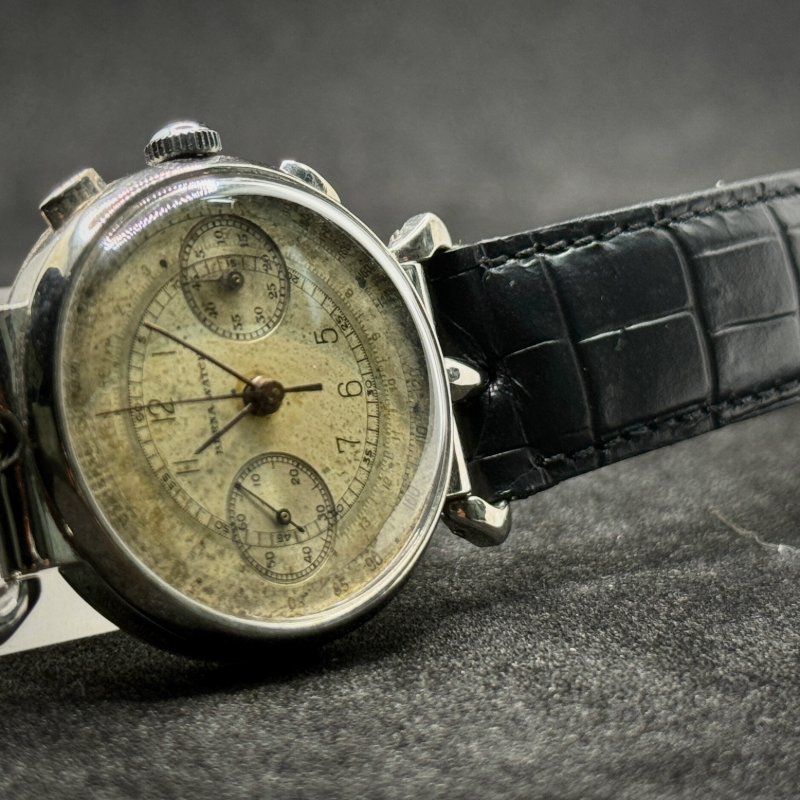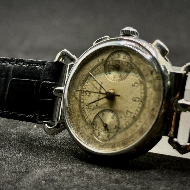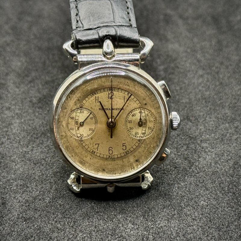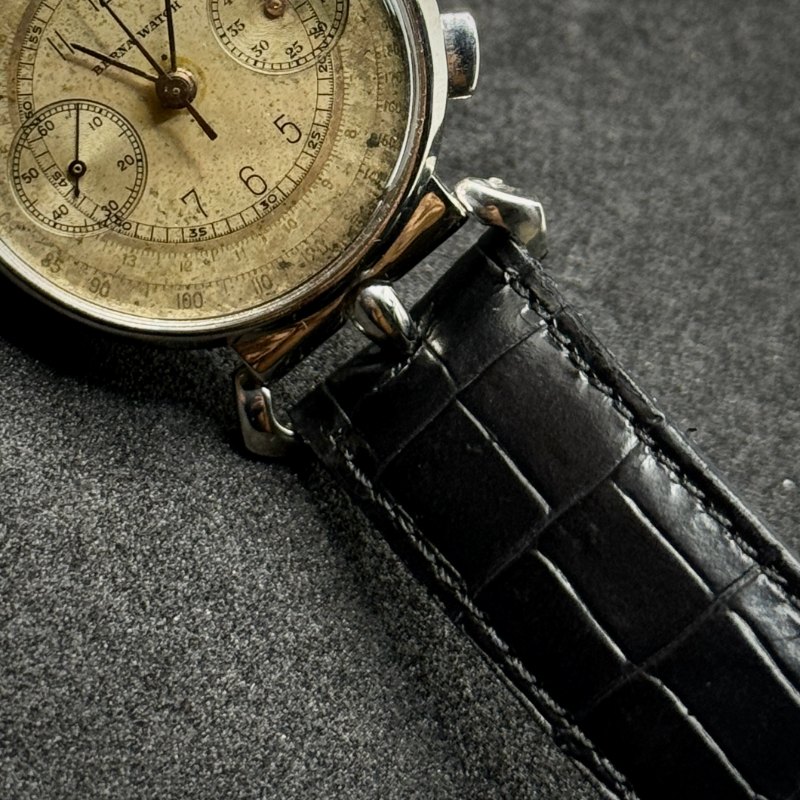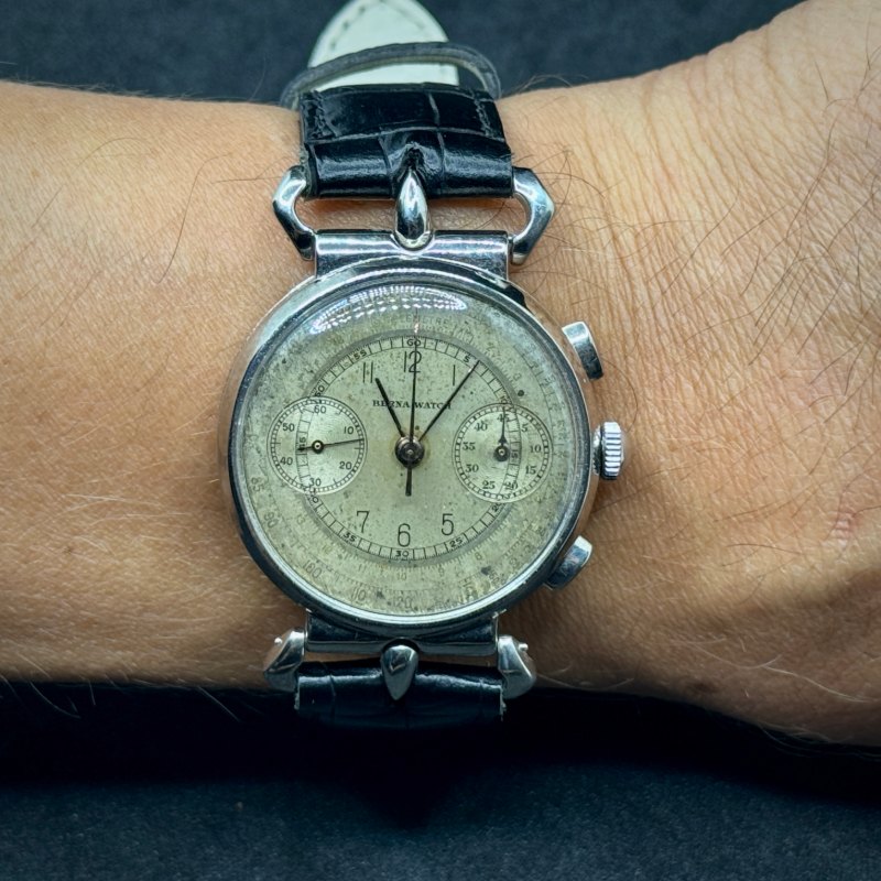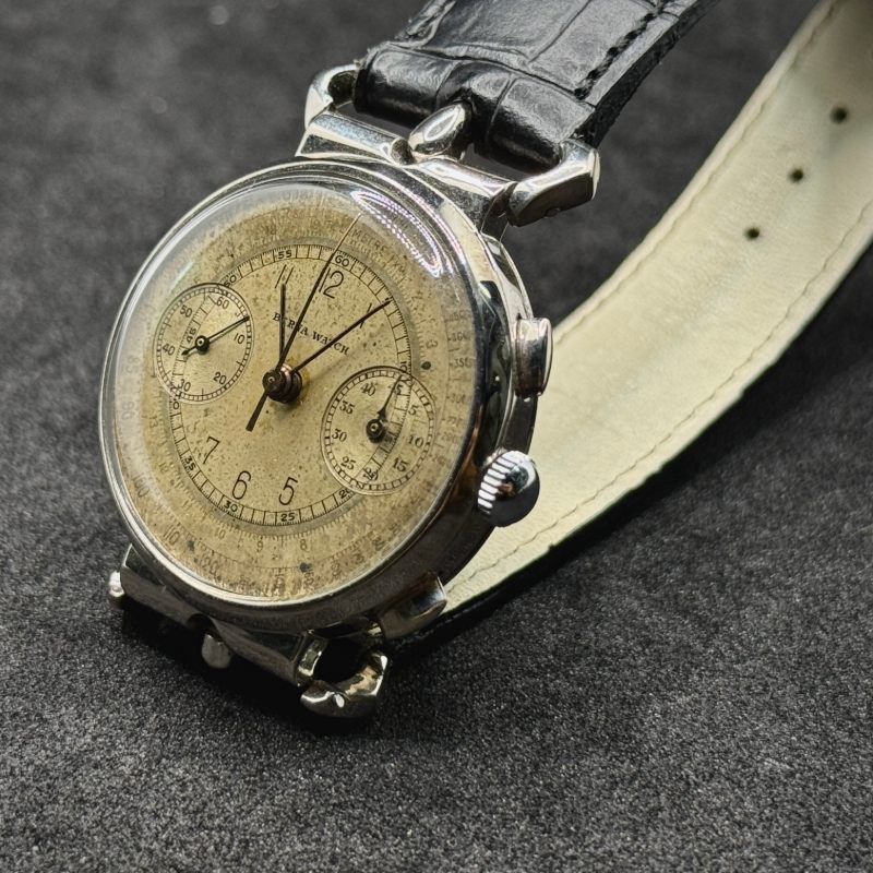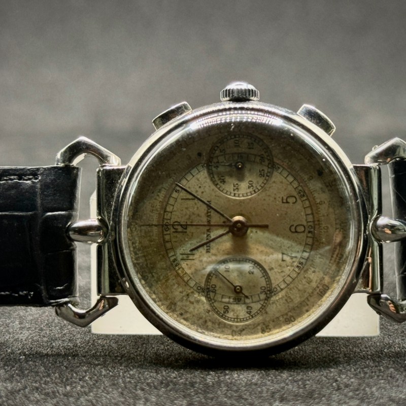 Berna Watch Vintage primi anni ’900 Ref. 124126 con calibro Vagioux manuale. Cassa 36 mm in ottone nichelato, cronografo, cinturino pelle, restaurato e garantito 24 mesi.