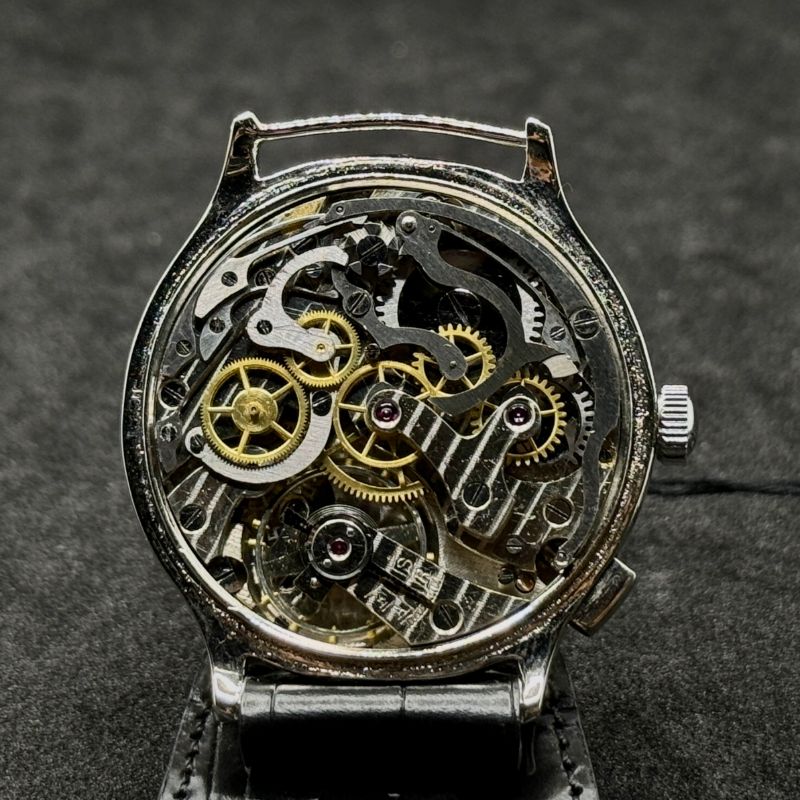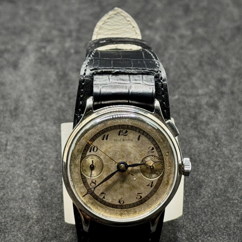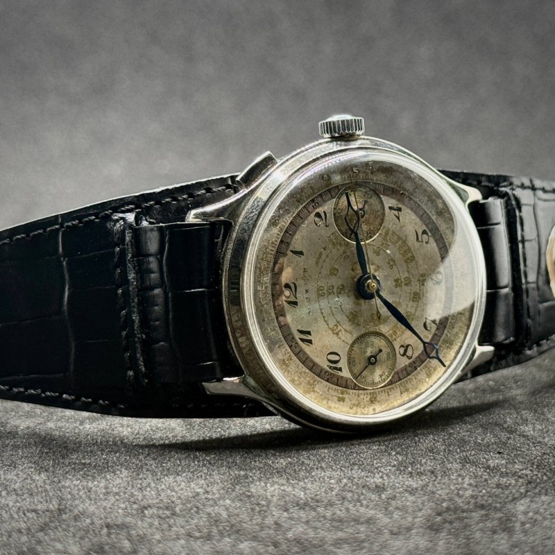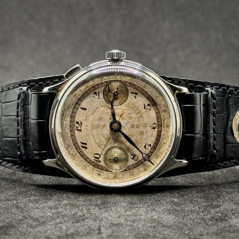 Questo orologio vintage di fine ’800 monta il calibro Landeron 2 a carica manuale, un movimento considerato pionieristico per l’epoca. In particolare, la funzione cronografo a mono pulsante lo rende un modello unico, simbolo dell’evoluzione orologiera tra XIX e XX secolo.