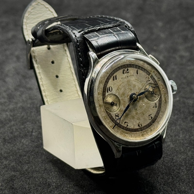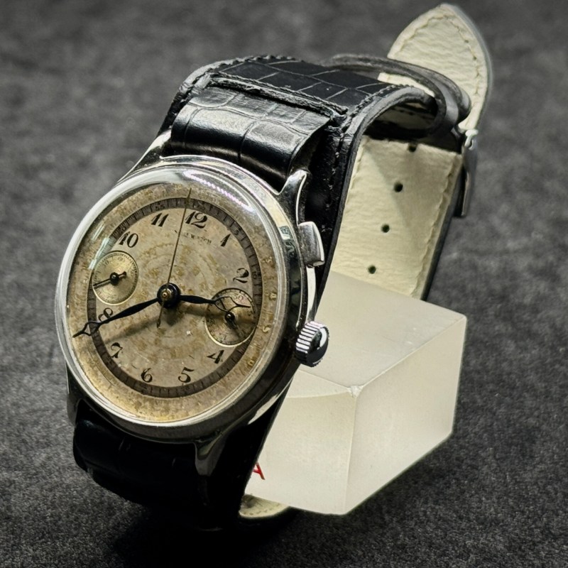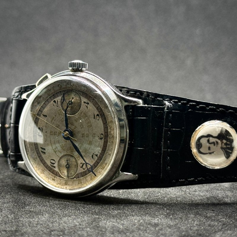 Orologio Vintage fine ’800 con calibro Landeron 2 manuale, cassa 40 mm in ottone nichelato e cinturino replica con foto originale. Restaurato, cronografo mono pulsante, garanzia 24 mesi, impermeabilità non testata.