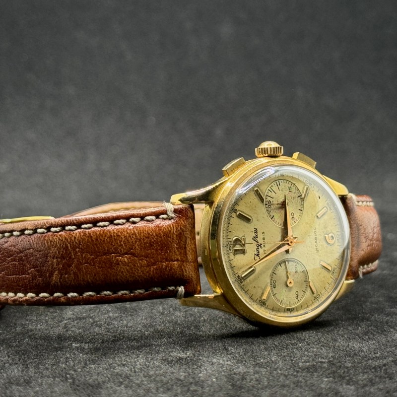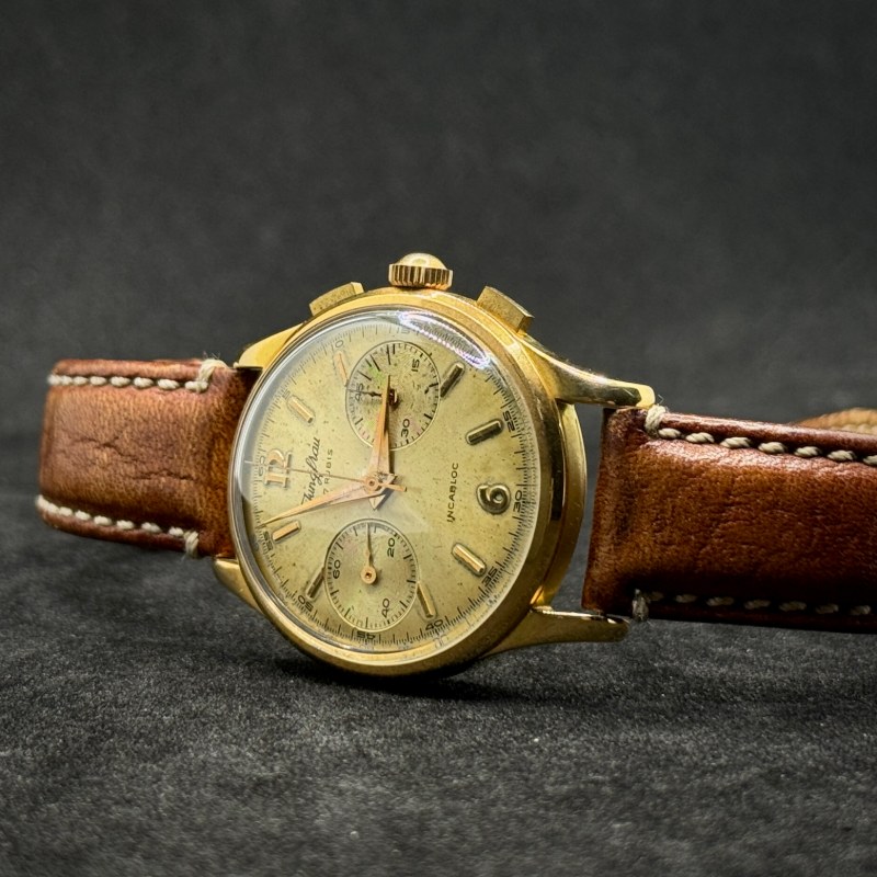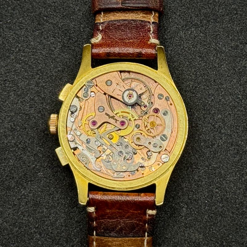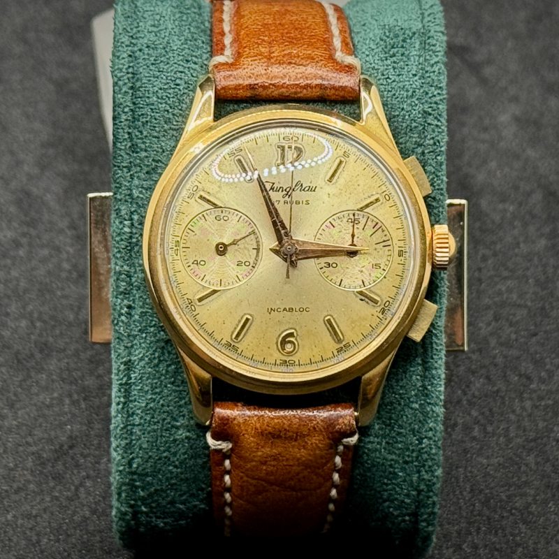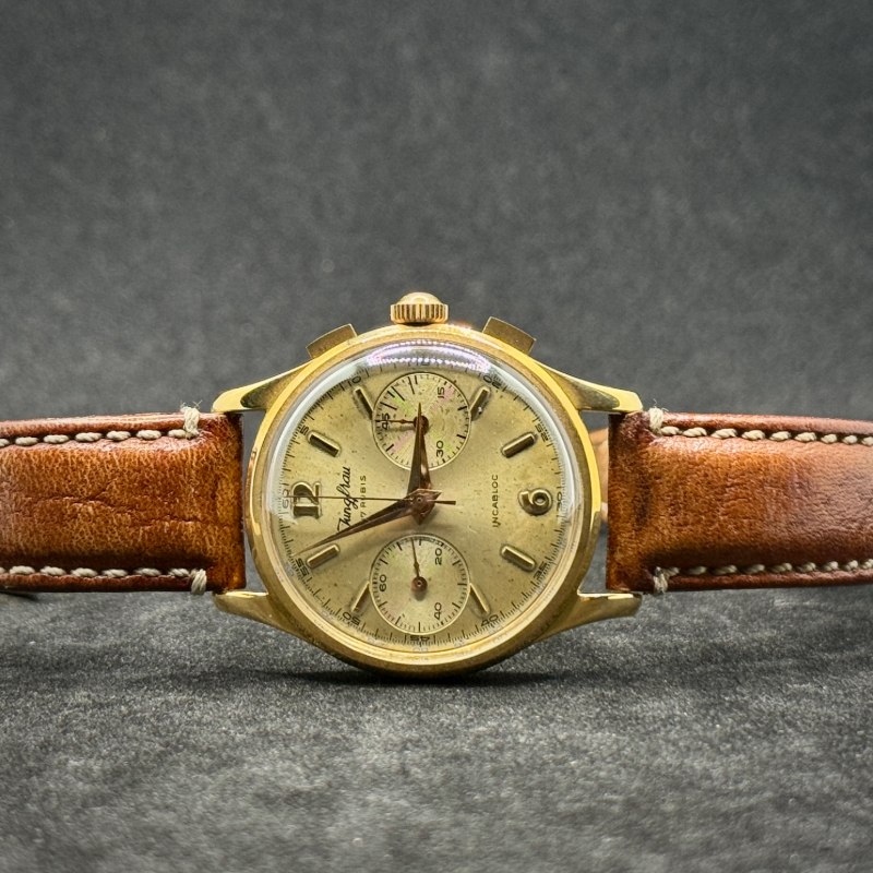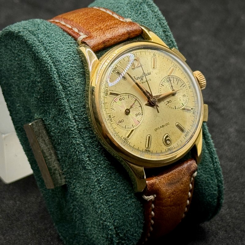 Jungfrau Vintage anni ’70 con calibro Landeron 149 manuale, cassa oro giallo 36 mm rinforzata e cinturino pelle. Orologio restaurato, cronografo, garanzia 24 mesi.