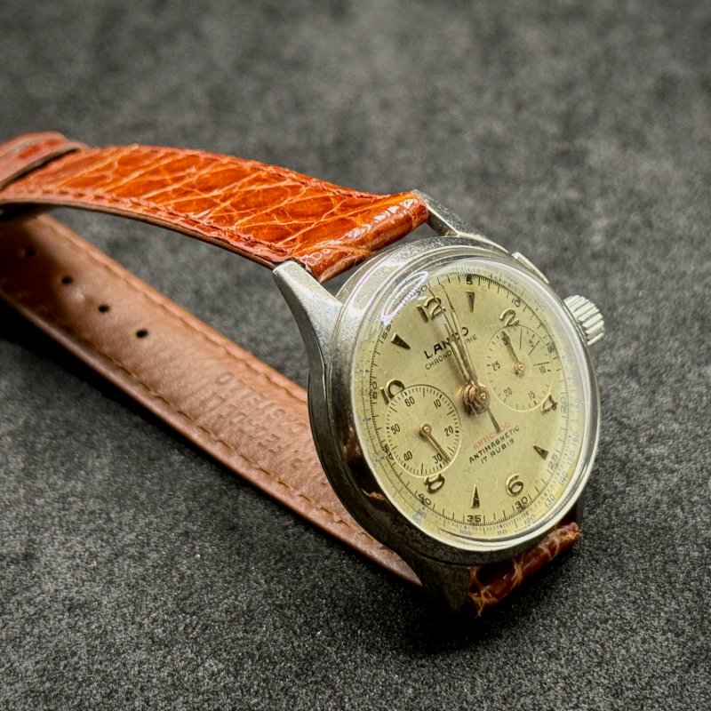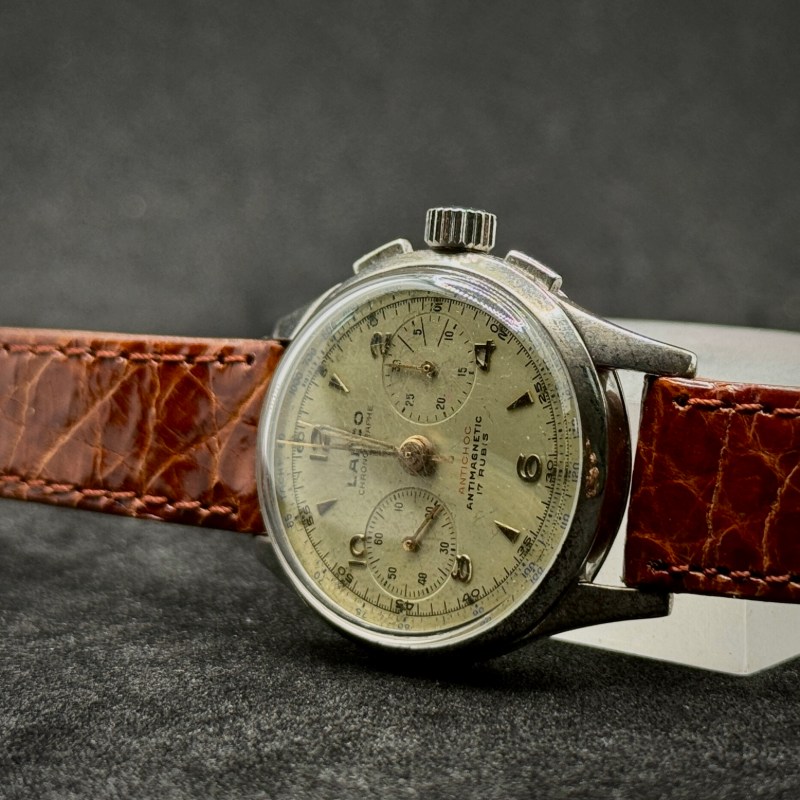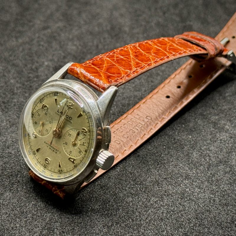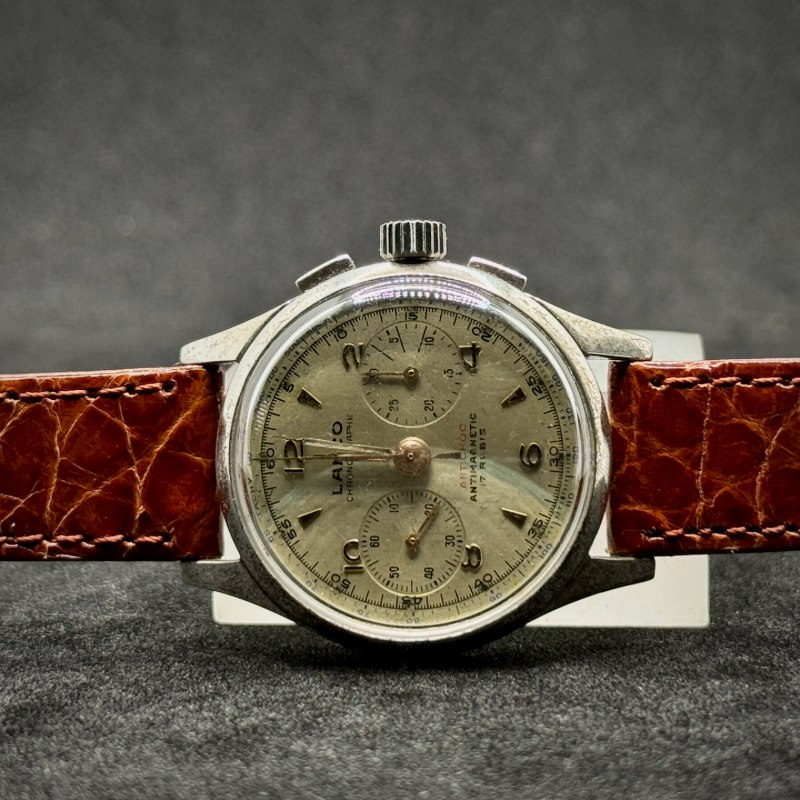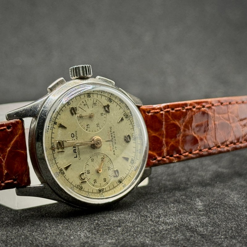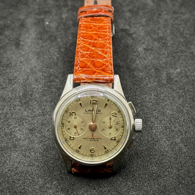 Lanco Vintage anni ’60 Ref. 252 con calibro Lemania 1275 manuale. Orologio 32 mm in ottone nichelato, cronografo, cinturino pelle, restaurato e garantito 24 mesi.