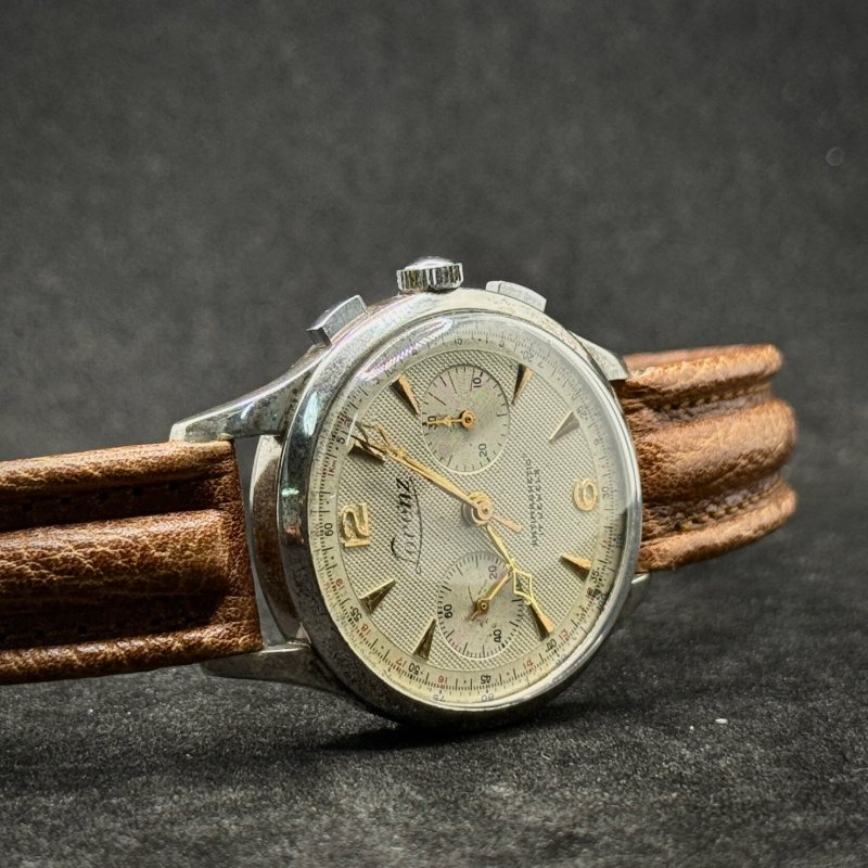 Lorenz Vintage Ref. 45525 anni ’70, calibro Landeron 248, restaurato e in ottime condizioni. Orologio 37 mm con cronografo, cinturino pelle, garanzia 24 mesi.