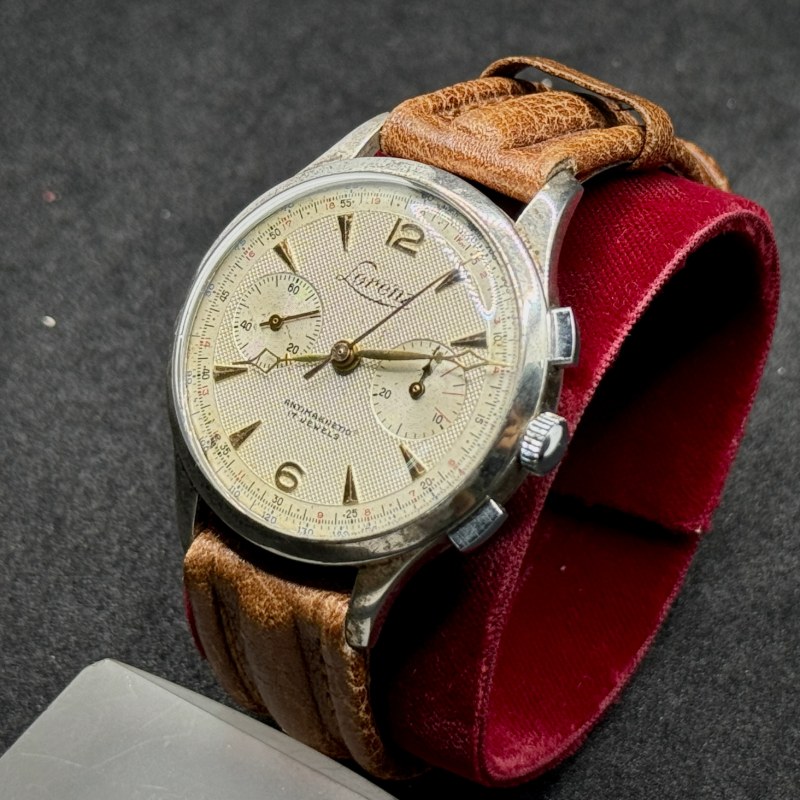 Il Lorenz Vintage Ref. 45525, con movimento meccanico Landeron 248, rappresenta un pezzo autentico degli anni ’70. Restaurato con cura e precisione, mantiene tutto il suo charme originale. La cassa da 37 mm in ottone nichelato con fondello in acciaio si abbina al cinturino in pelle (sostituito, non originale, ma facilmente intercambiabile), per un look classico e senza tempo.