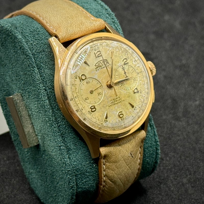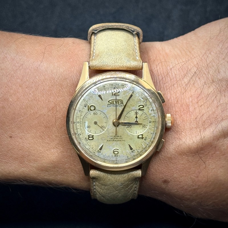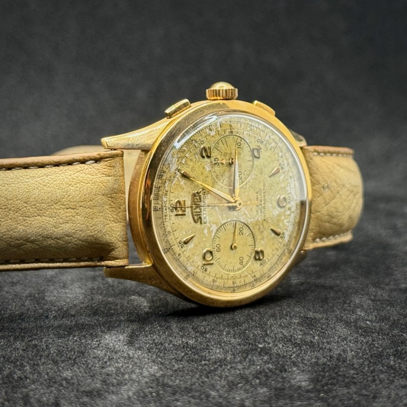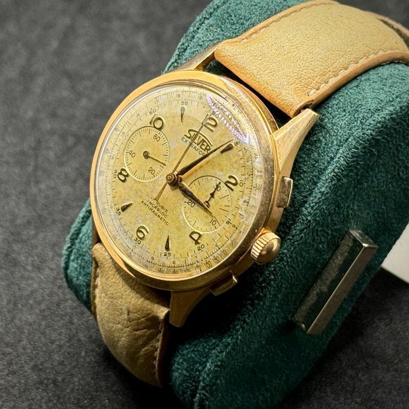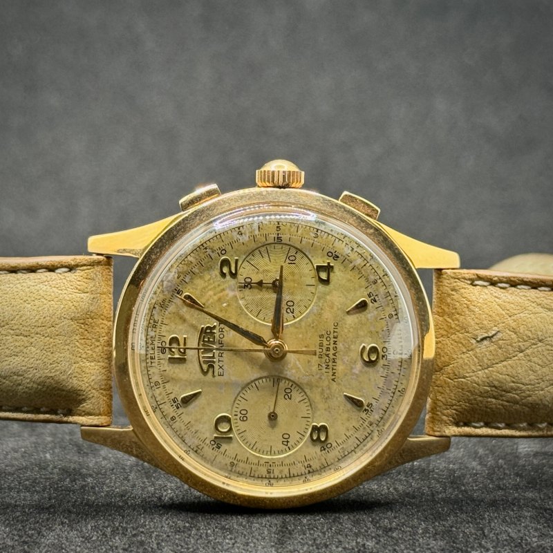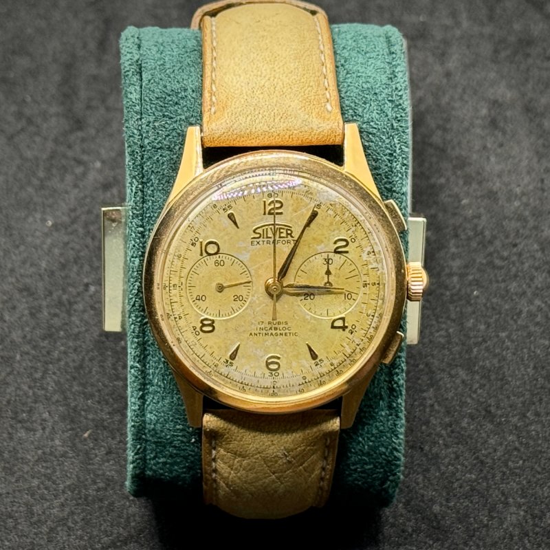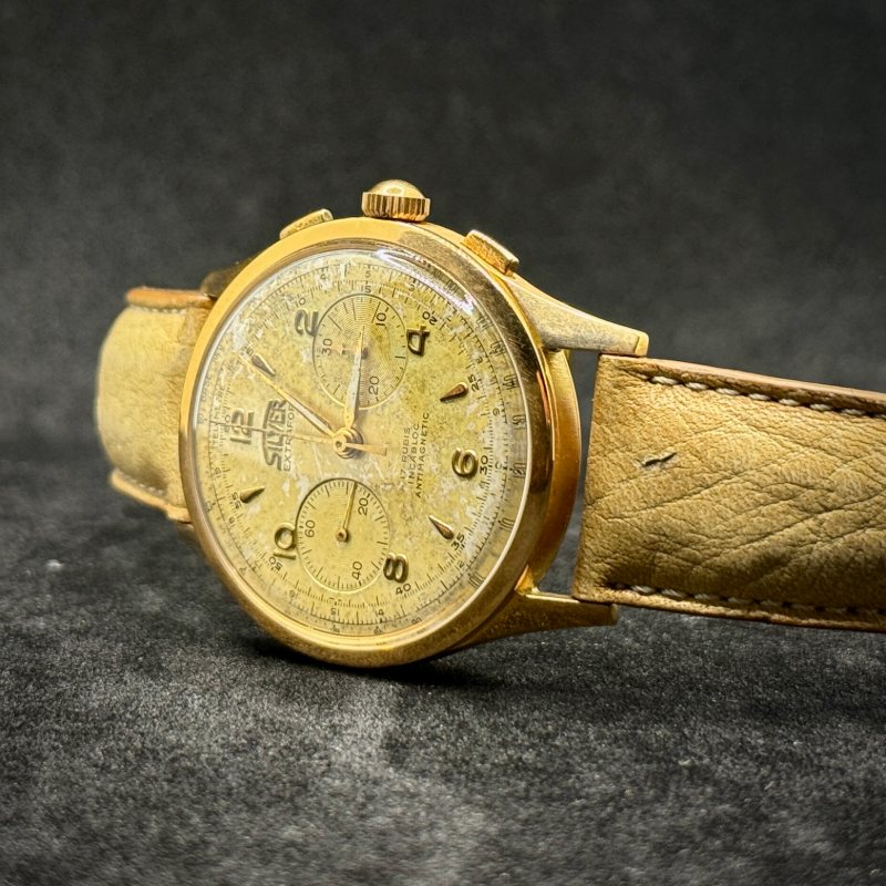 Silver Extrafort Vintage Ref. 102 anni ’60/’70 in oro 18Kt, 38 mm. Movimento Vagioux 92 a carica manuale con cronografo. Restaurato, garanzia 24 mesi.