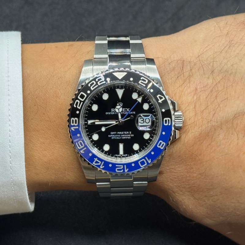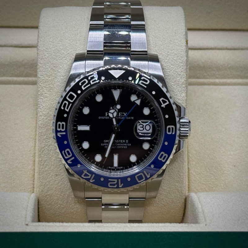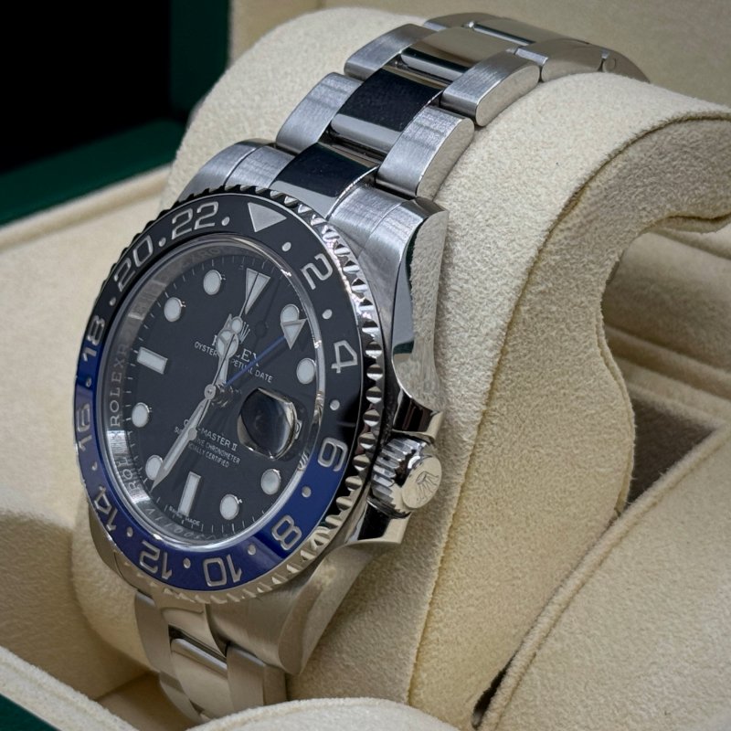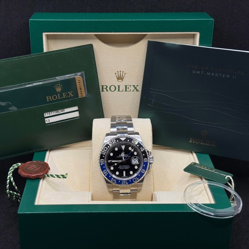 Rolex GMT-Master II 116710BLNR “Batman” anno 2014, Full Set con scatola e garanzia. Acciaio 40 mm, calibro 3186, vetro zaffiro e lunetta ceramica nera e blu.